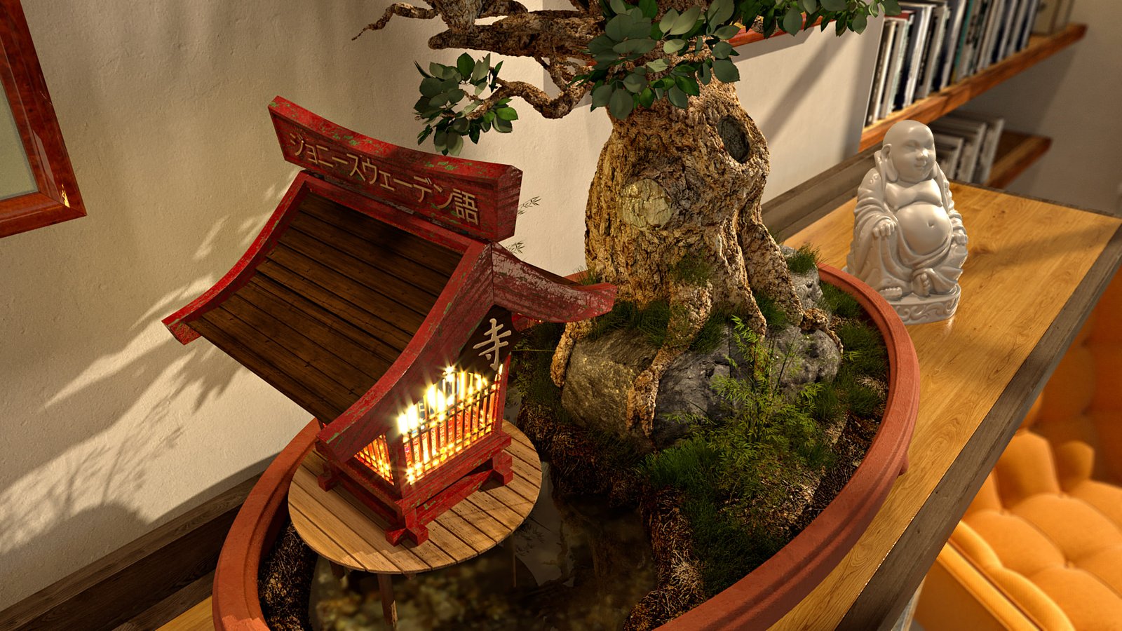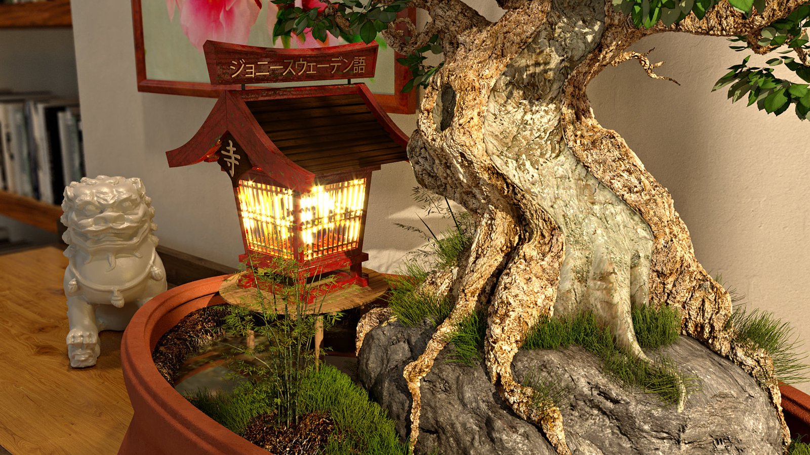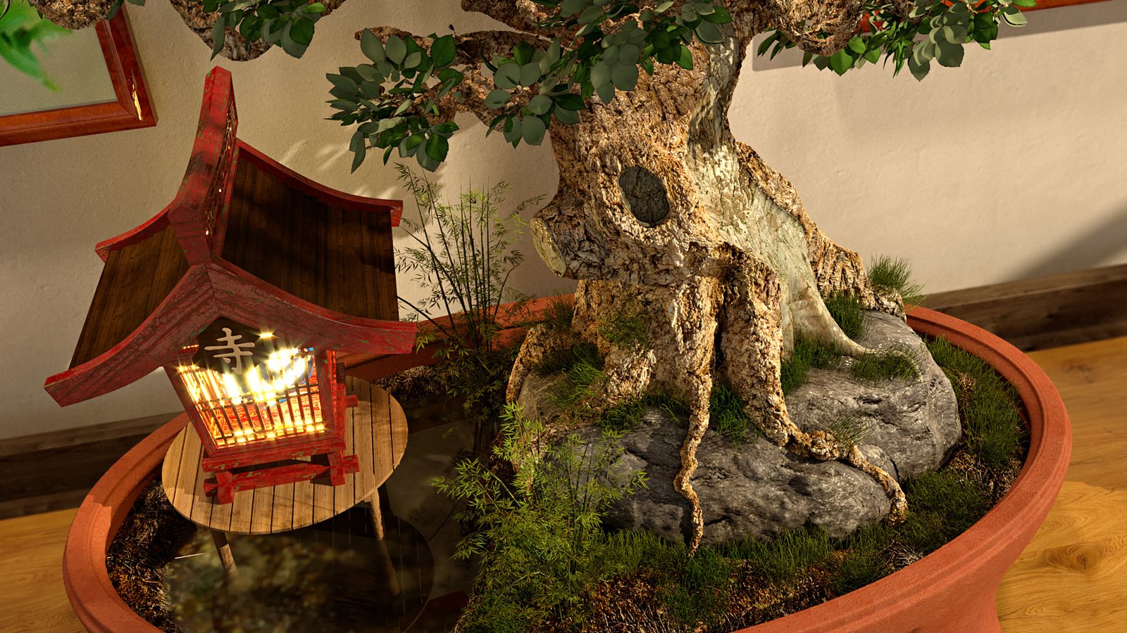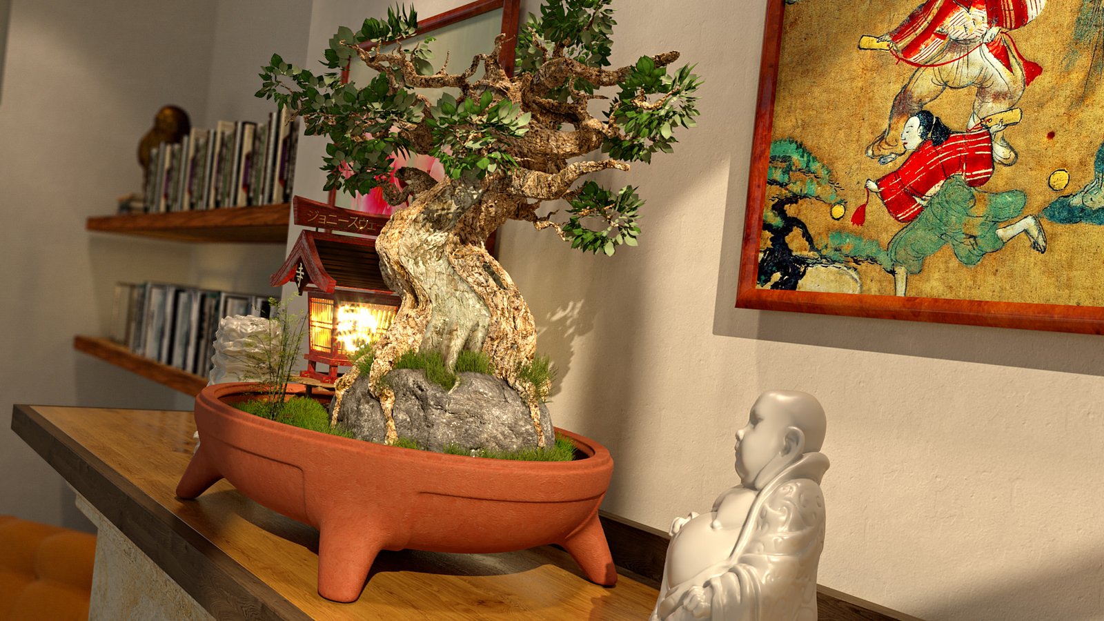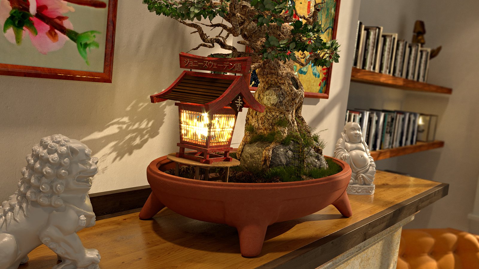 The tree trunk, ground & rock was all modelled using the sculpt tool painting geometry, similar to Z-Brush. The pot was modelled using basic polygons with a ‘Hyper-Nurb’ applied to create the smoothness. All other bits like sculptures and shelf objects were downloaded. The textures are a mixture of hand made using PixPlant 3 and libraries including the brilliant Siger Studio.