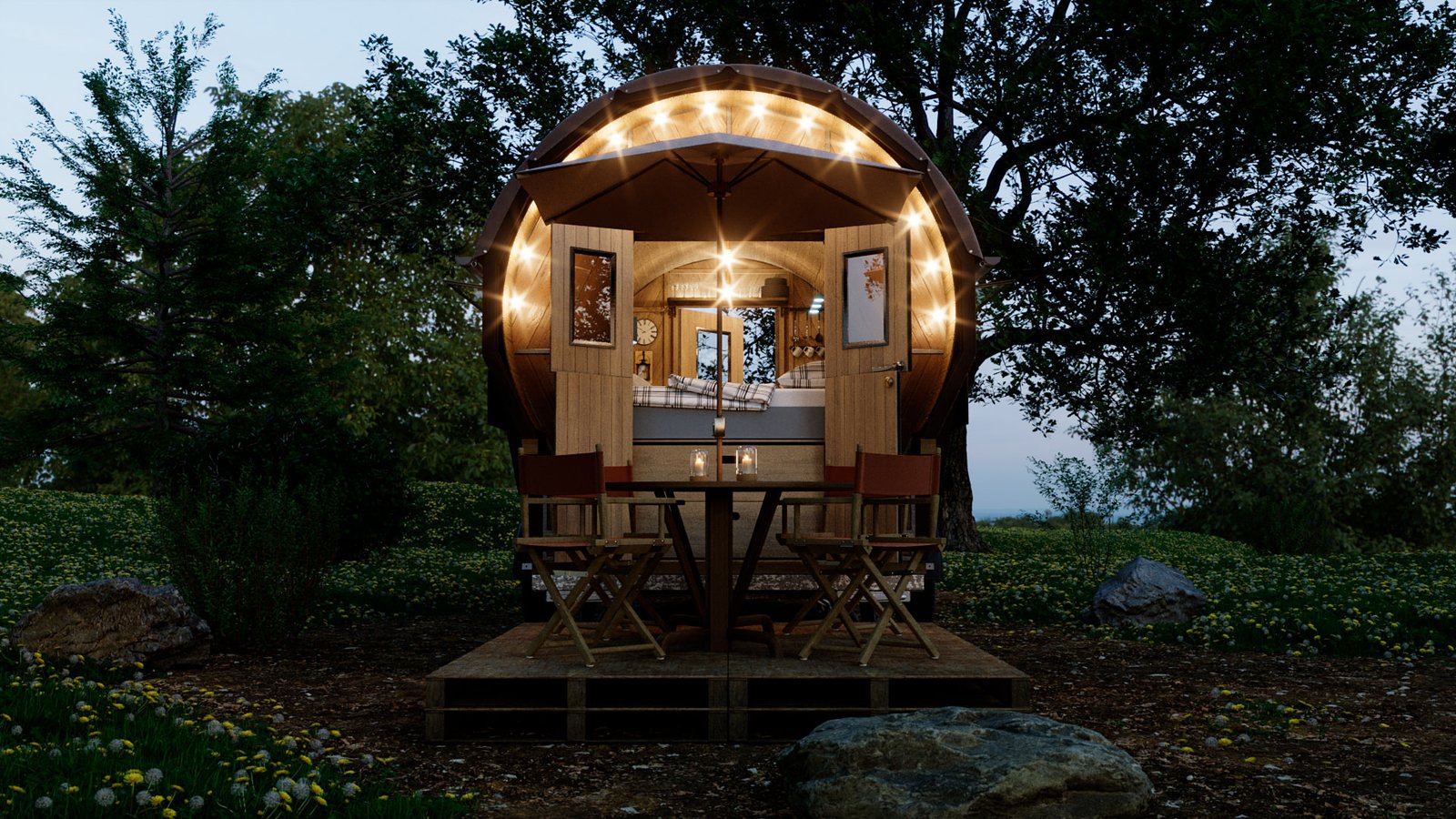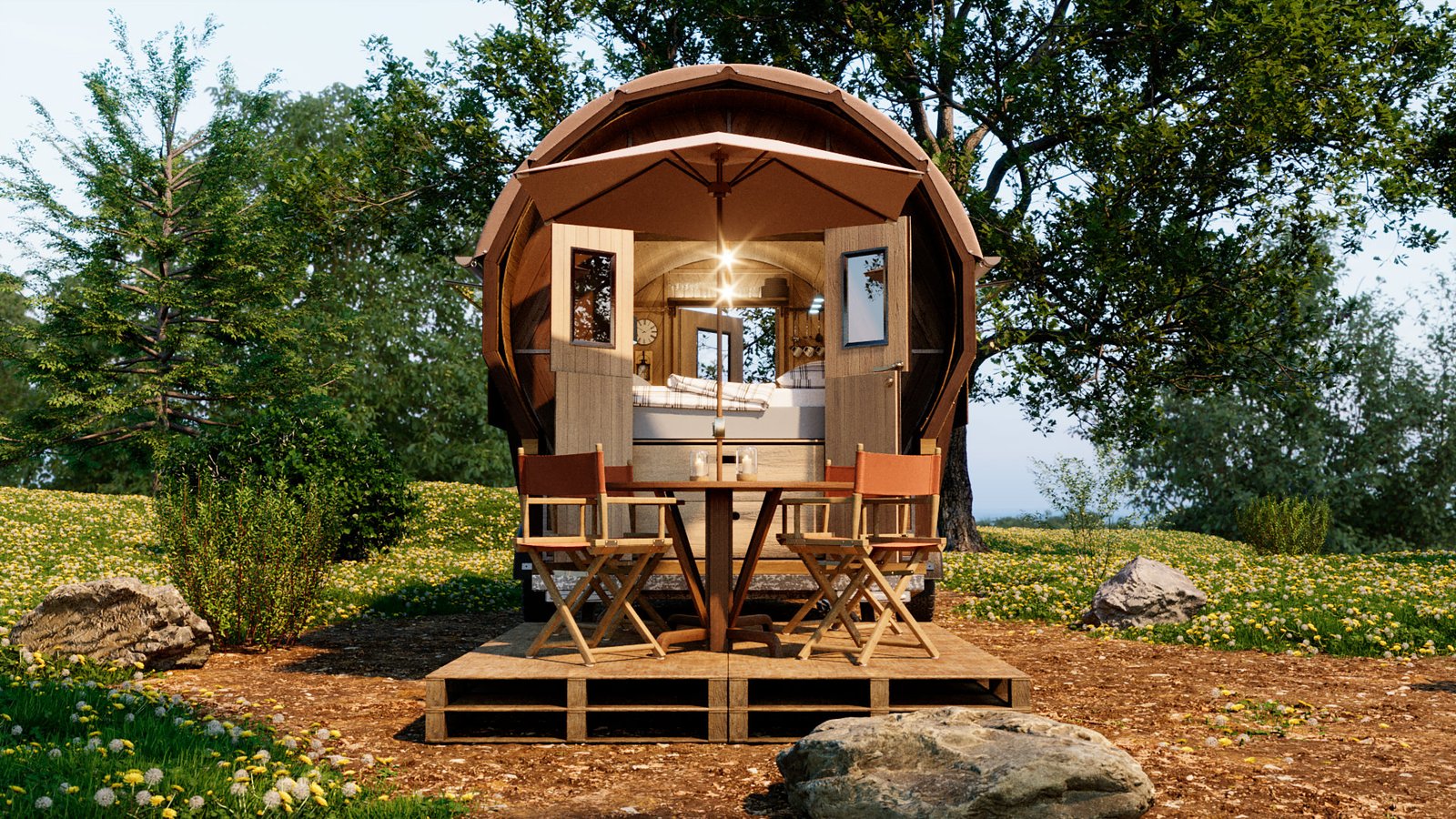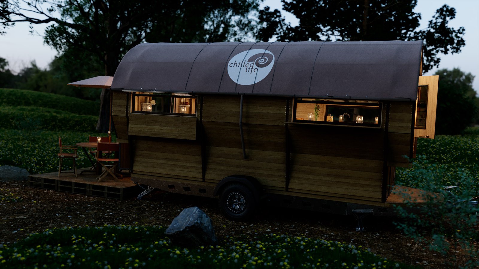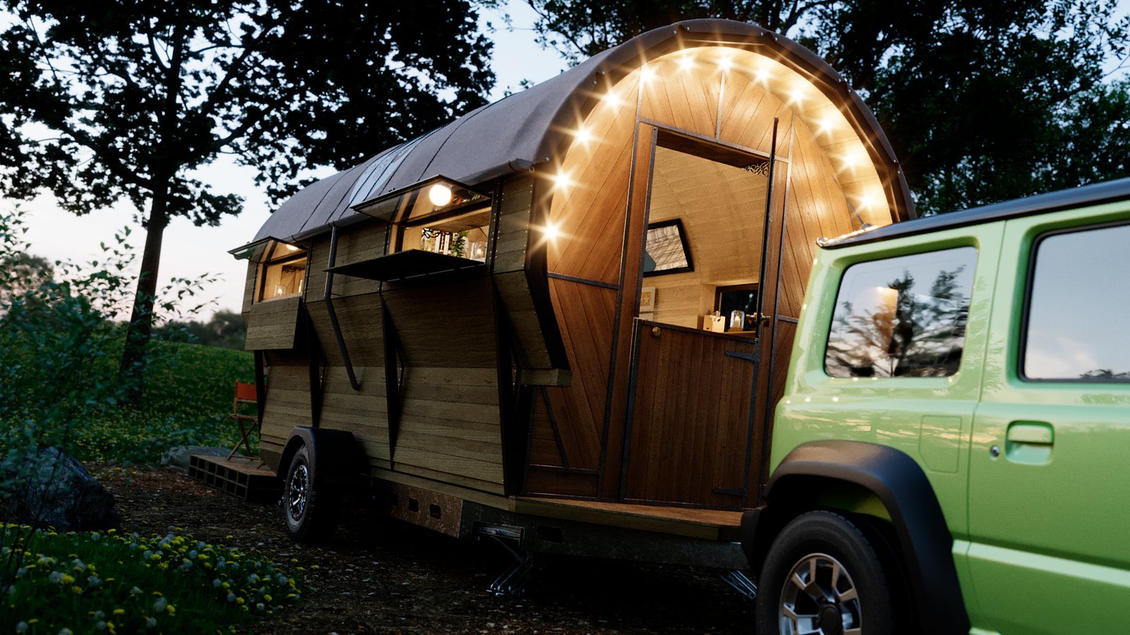 First was the floor wood frame, then the wagon frame arches followed by the door ends. I then created all the wall slats for the walls. Finally design the interior units and and lighting and materials. I chose the wood from my library of materials. The last bit was the trailer unit which he supplied as a STL file. This was textured up then I created a camp site environment in Cinema 4D and rendered with Corona Renderer.