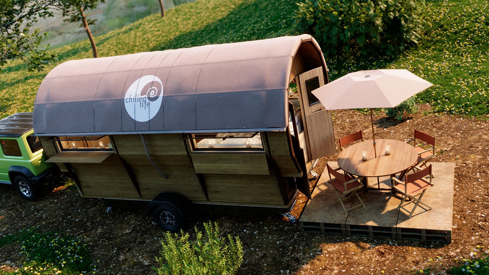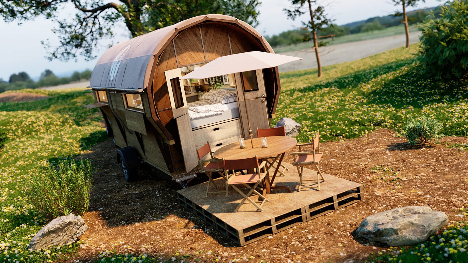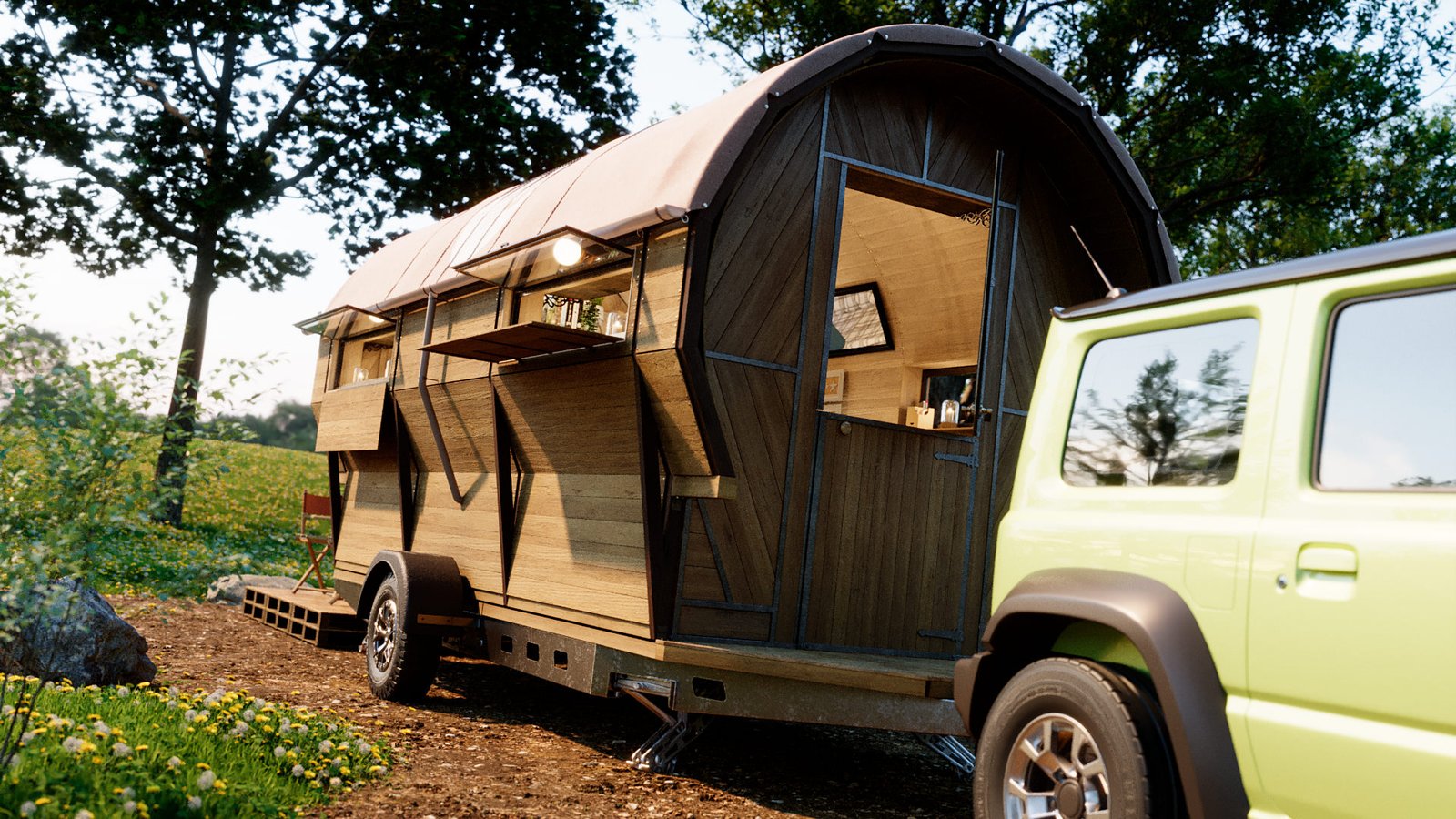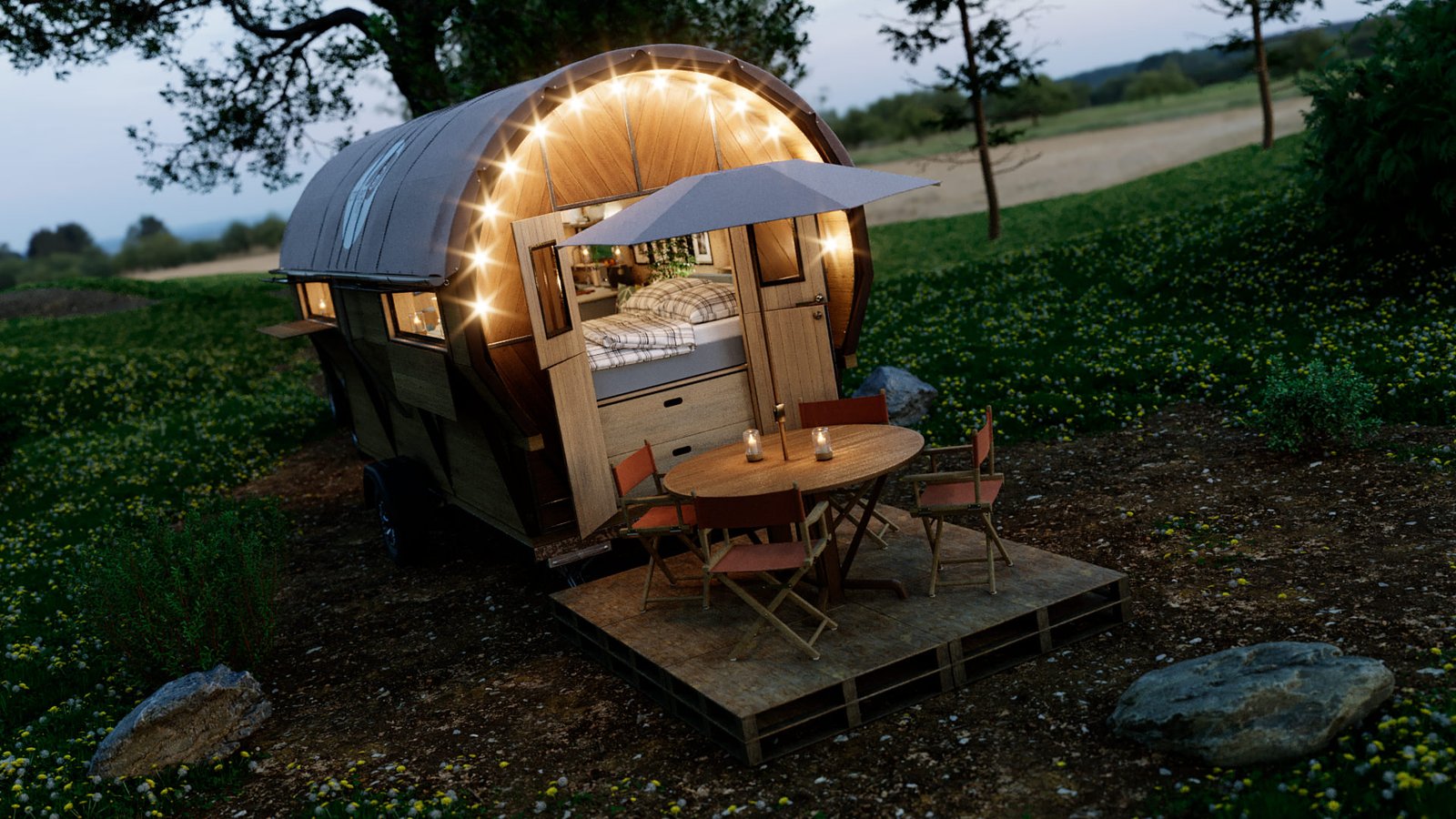 First was the floor wood frame, then the wagon frame arches followed by the door ends. I then created all the wall slats for the walls. Finally design the interior units and and lighting and materials. I chose the wood from my library of materials. The last bit was the trailer unit which he supplied as a STL file. This was textured up then I created a camp site environment in Cinema 4D and rendered with Corona Renderer.