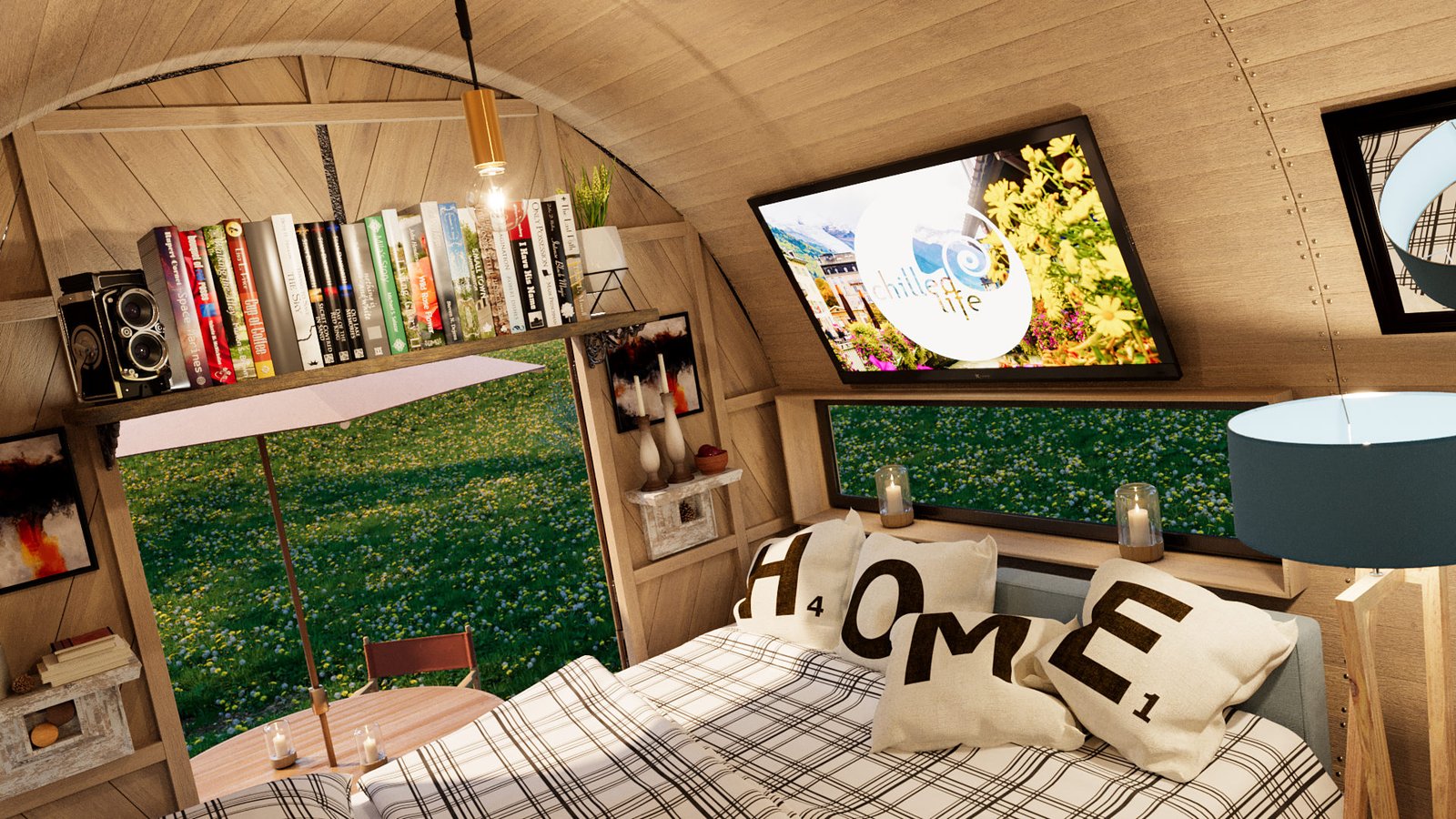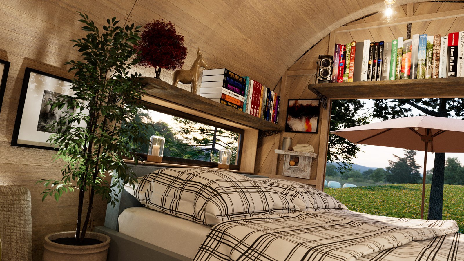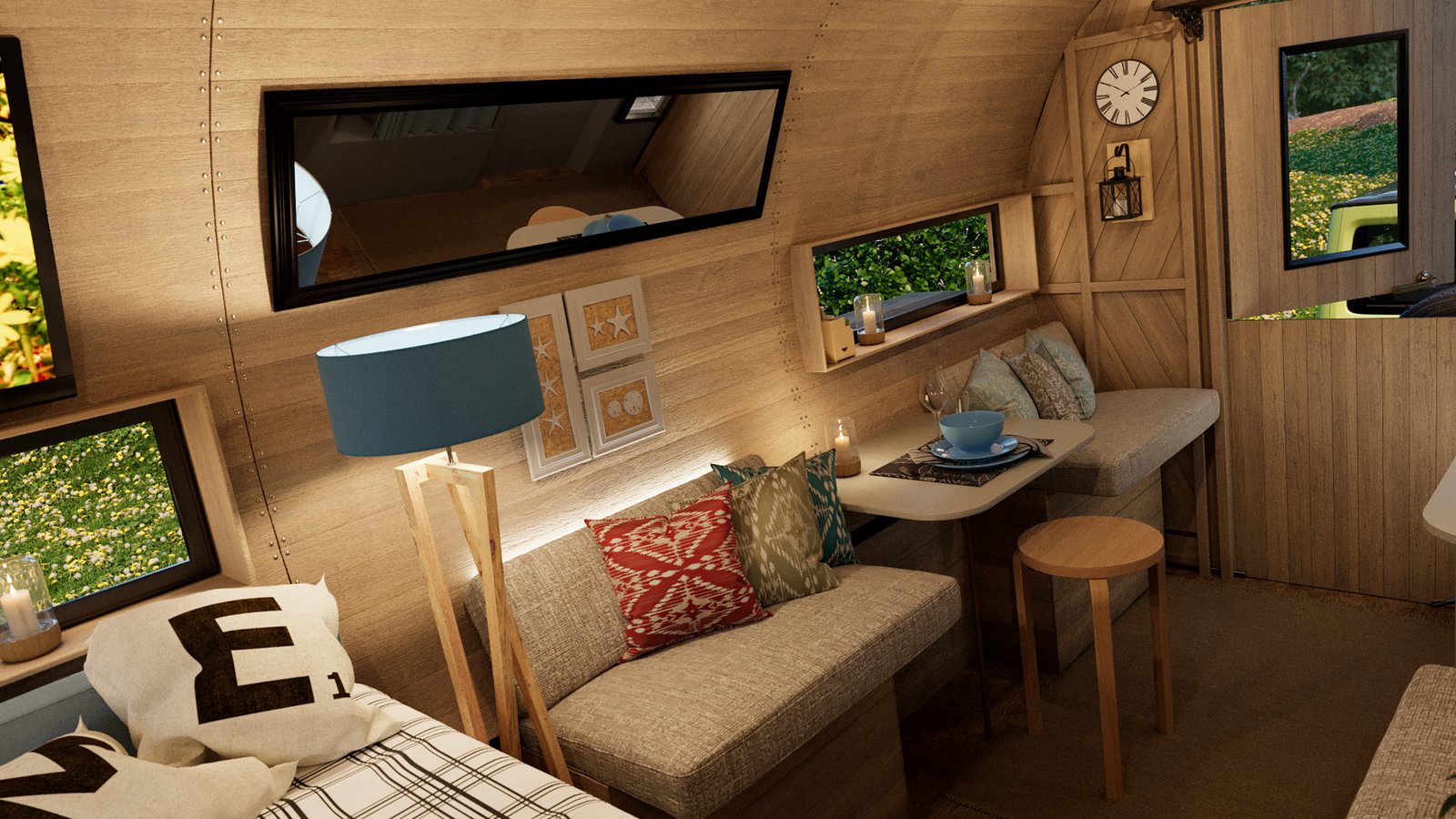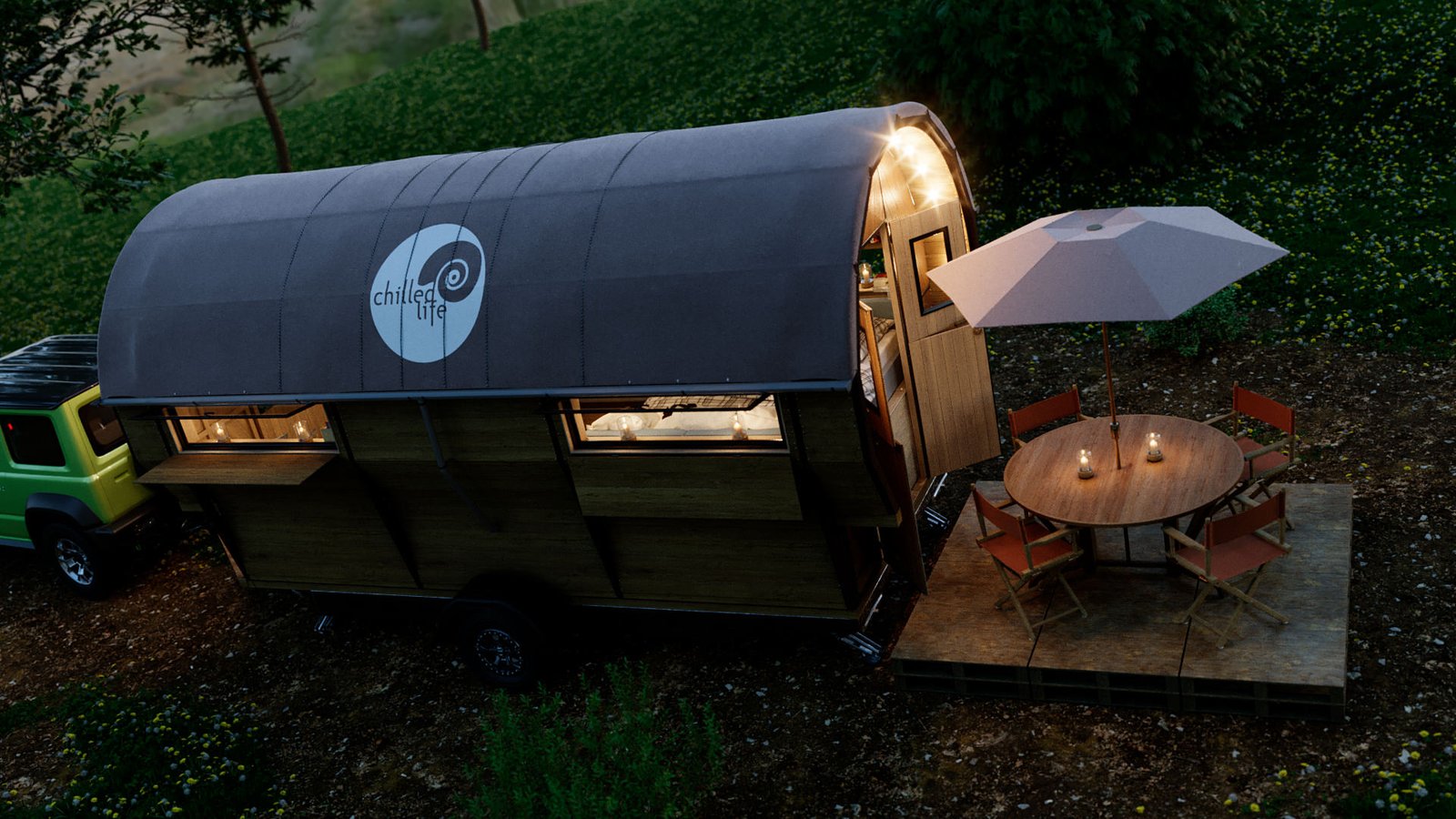 First was the floor wood frame, then the wagon frame arches followed by the door ends. I then created all the wall slats for the walls. Finally design the interior units and and lighting and materials. I chose the wood from my library of materials. The last bit was the trailer unit which he supplied as a STL file. This was textured up then I created a camp site environment in Cinema 4D and rendered with Corona Renderer.