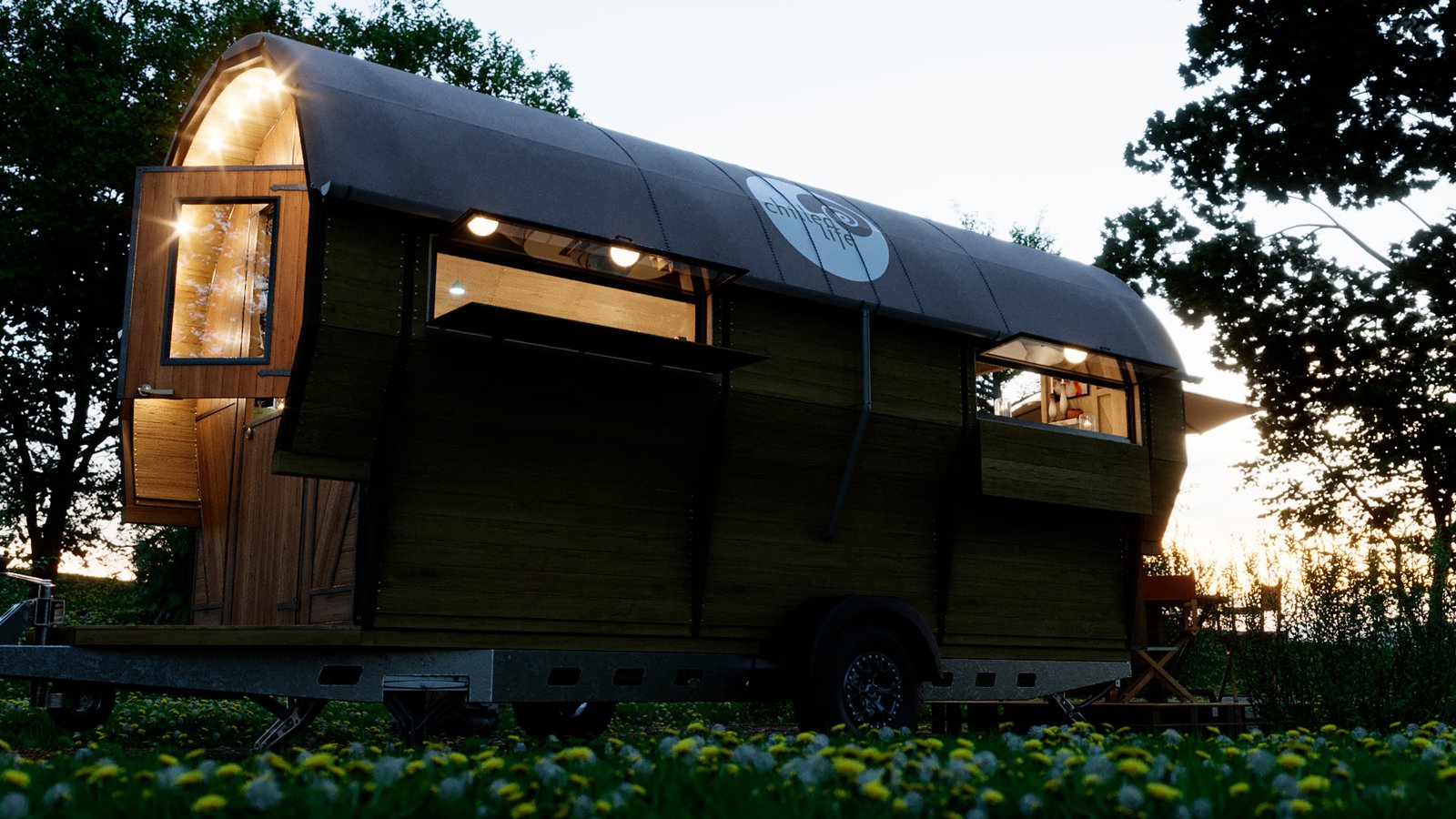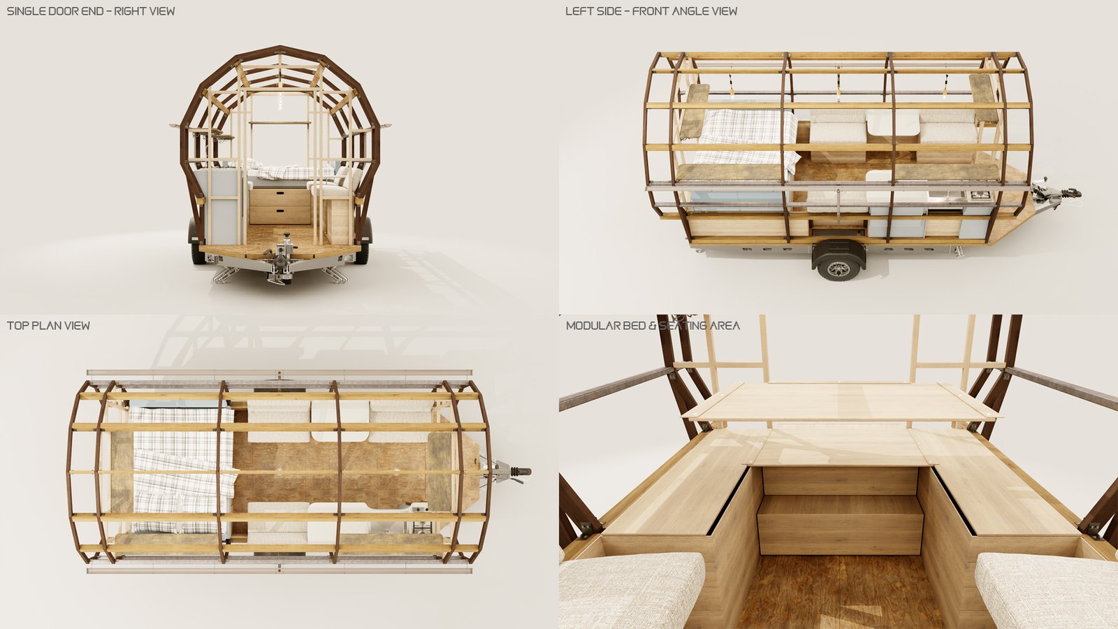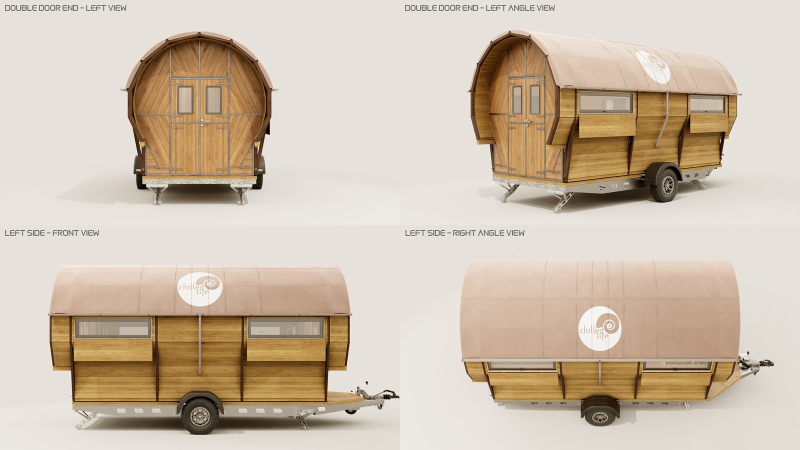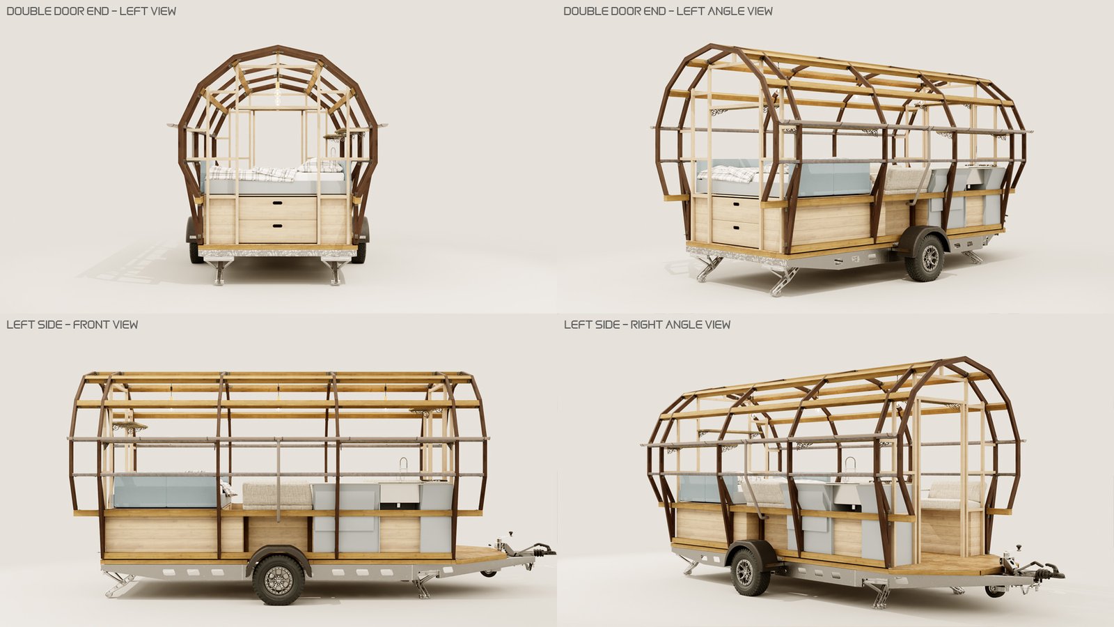 I worked with Kevin Armson, a friend of mine down the street to create these 3D visuals of his Wagons. These are designed either for festival use or living. He has already done some prototypes and gave me complete CAD drawings to work from.