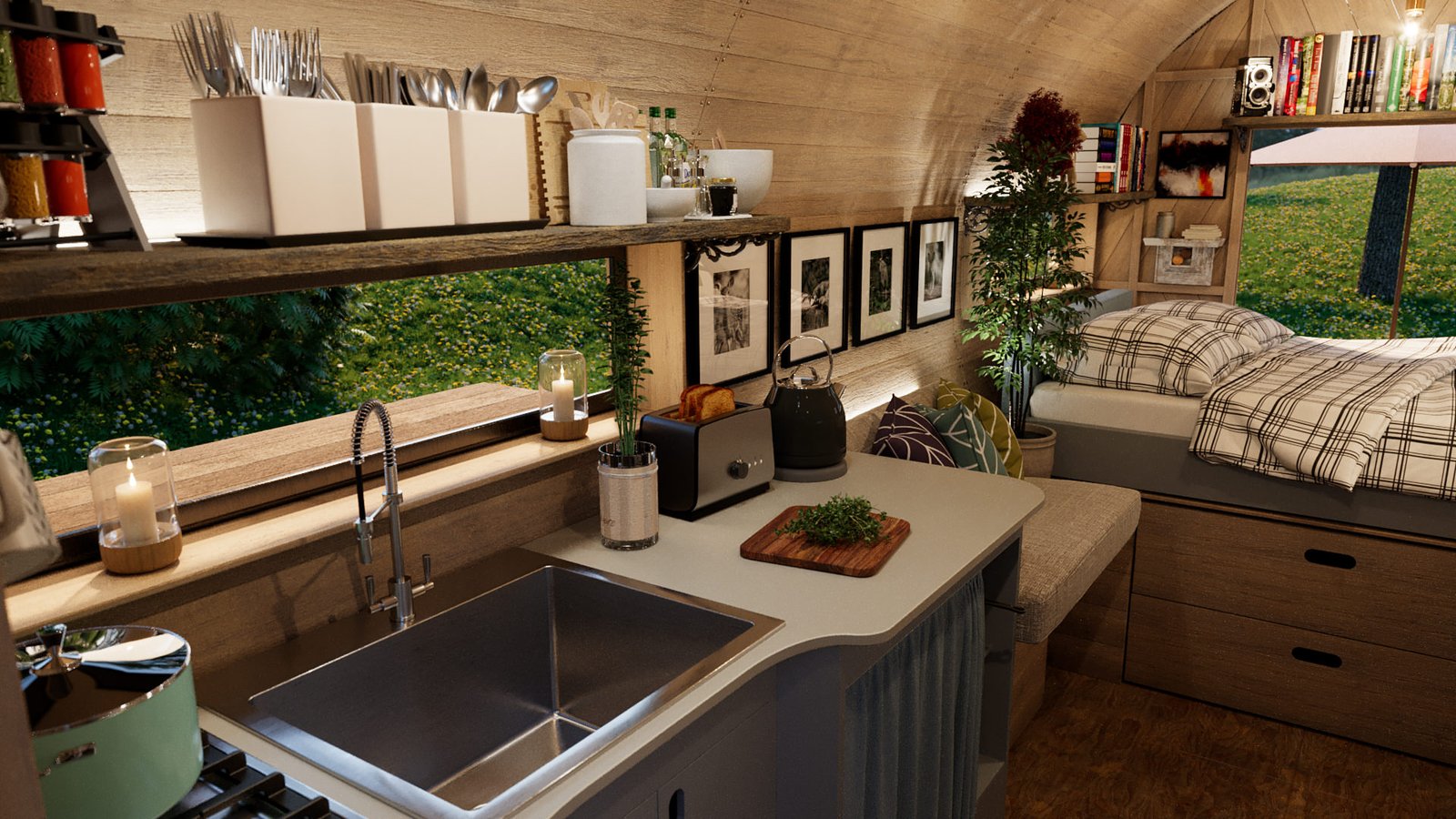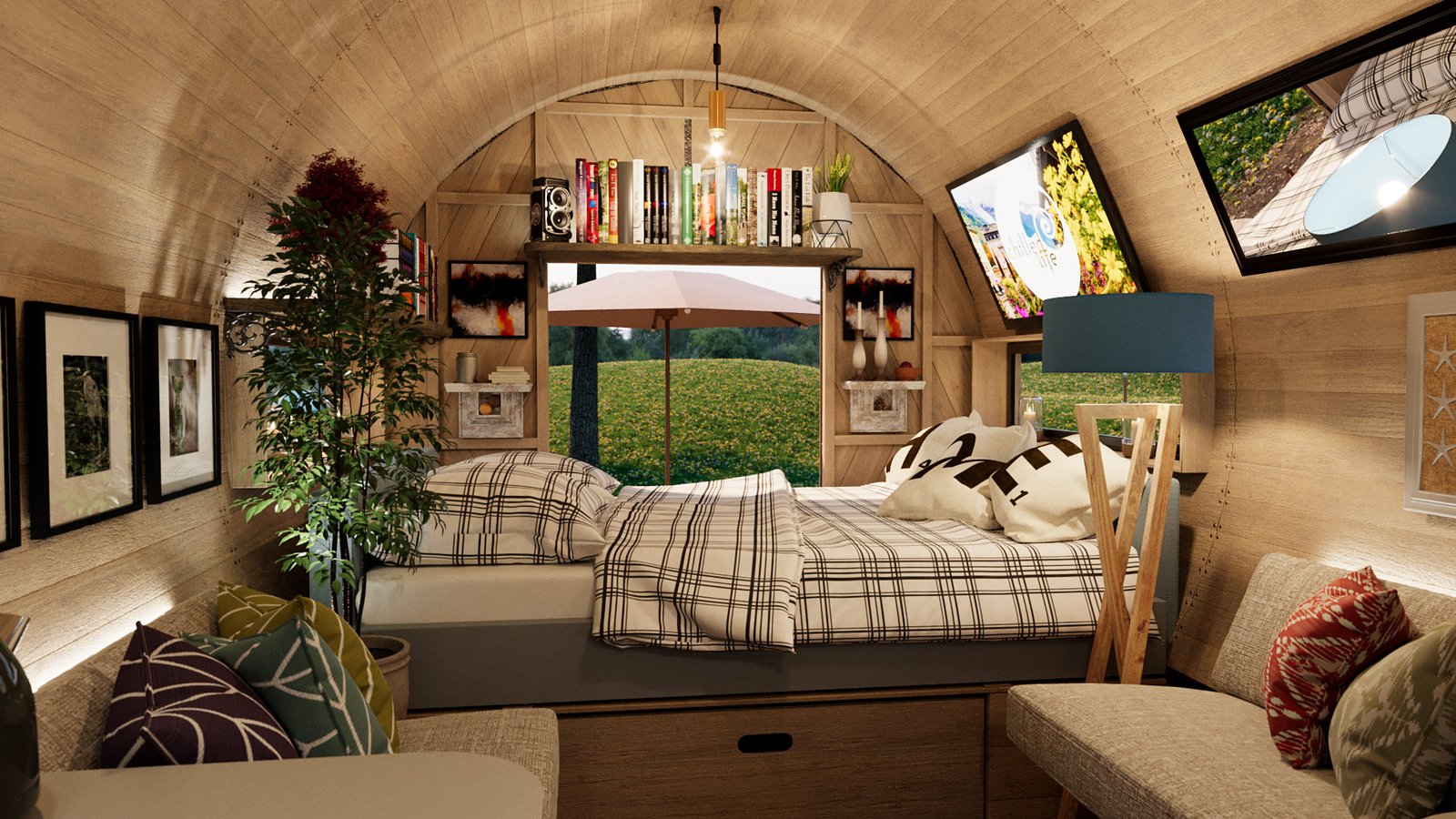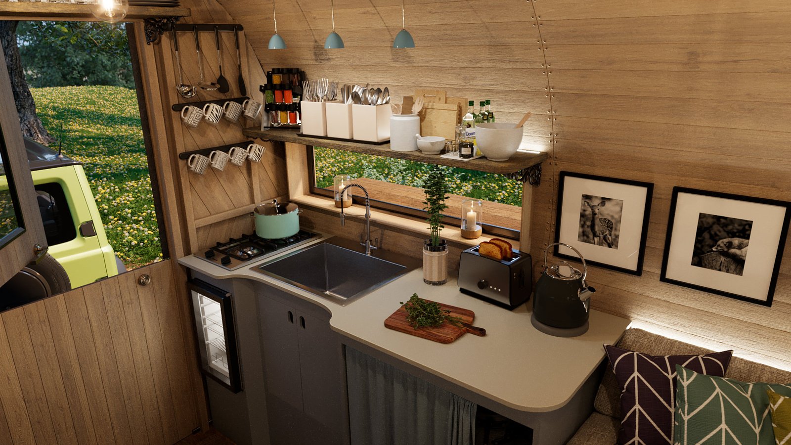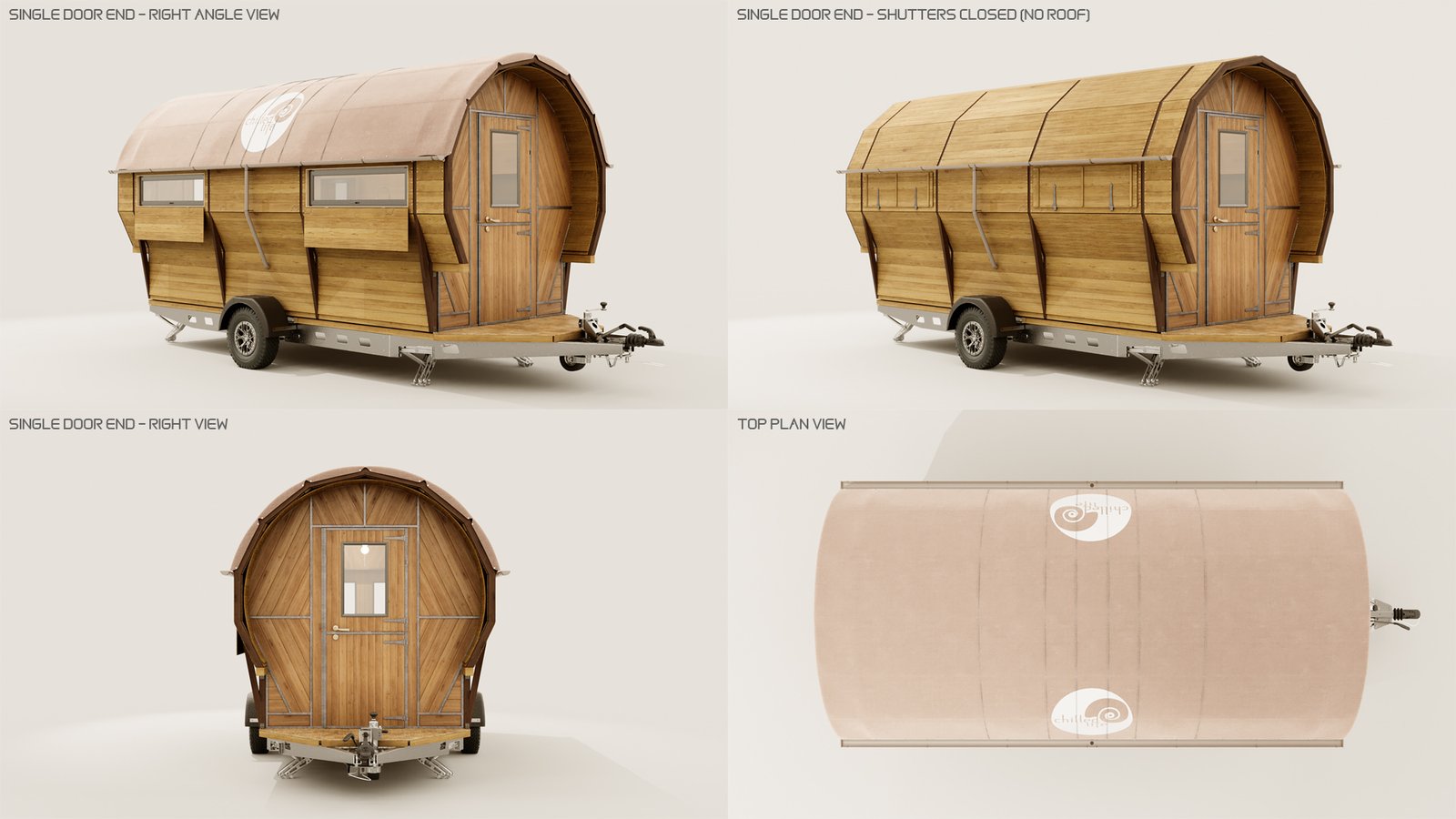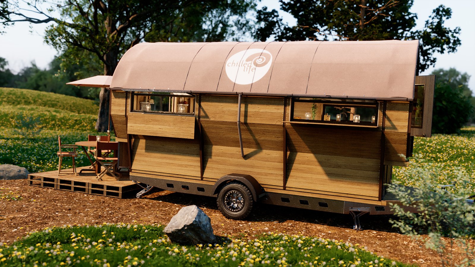 I worked with Kevin Armson, a friend of mine down the street to create these 3D visuals of his Wagons. These are designed either for festival use or living. He has already done some prototypes and gave me complete CAD drawings to work from.