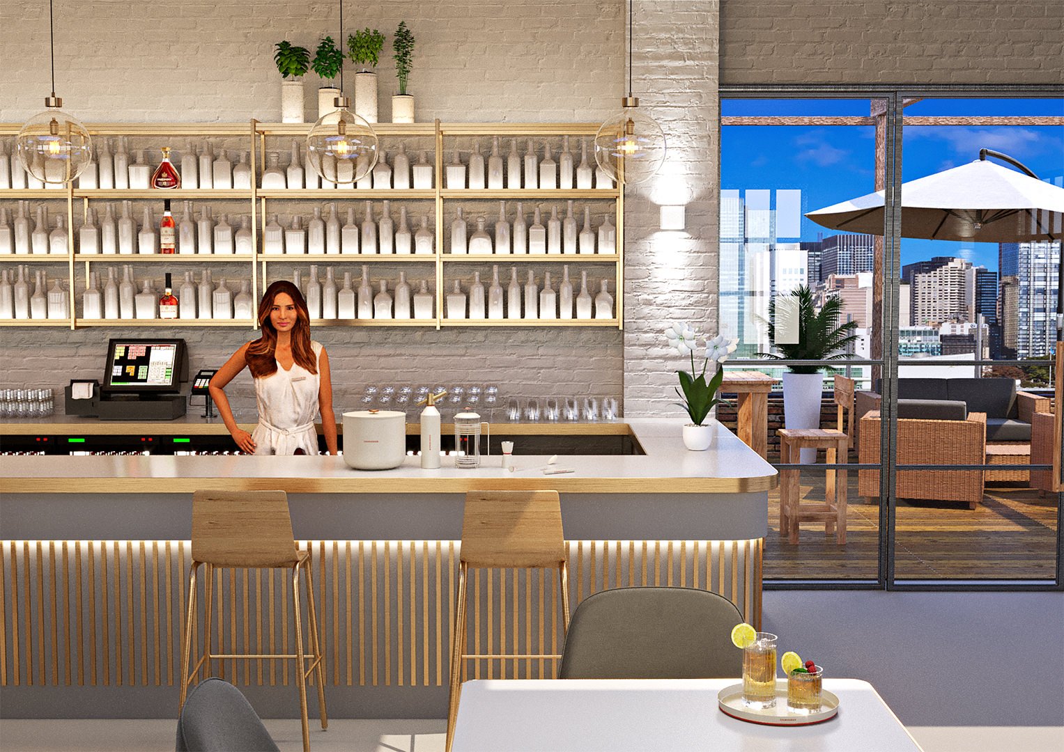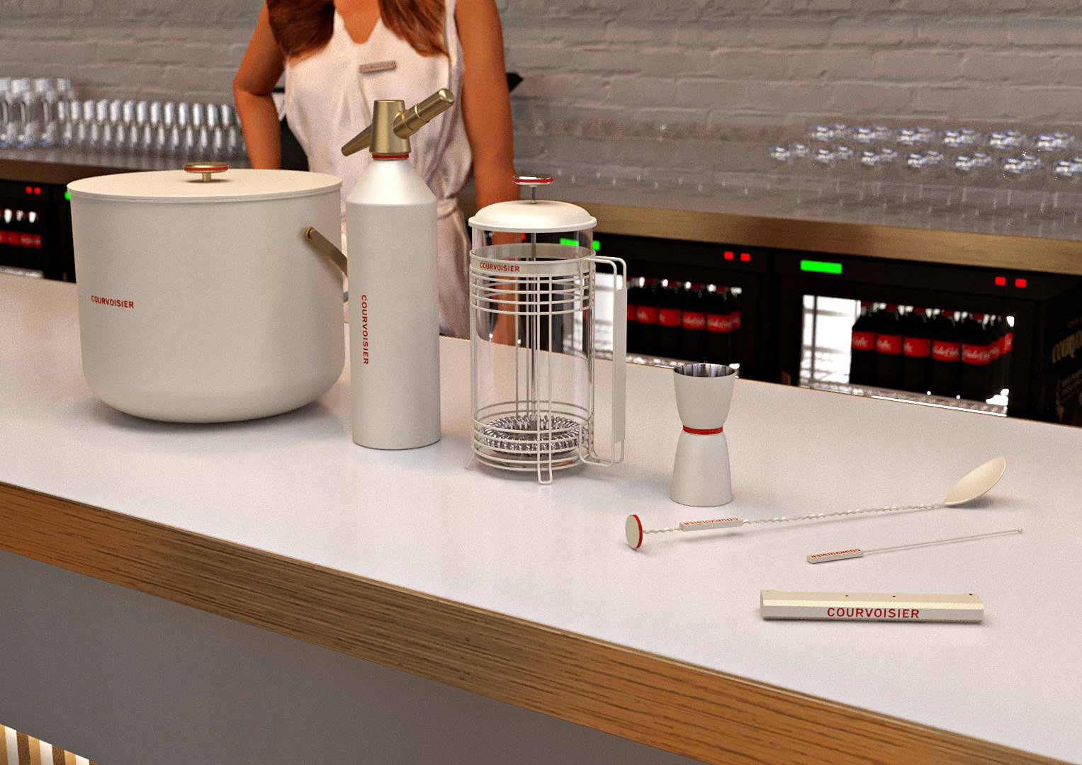 I used a pre-built bar scene I bought and stripped out the bar and other unnecessary objects. All materials had to be converted to Corona Renderer. The bar was modelled from drawings supplied from Wonderworks including STL models of the serving objects. These were textured using Siger Studio’s brilliant metal materials.