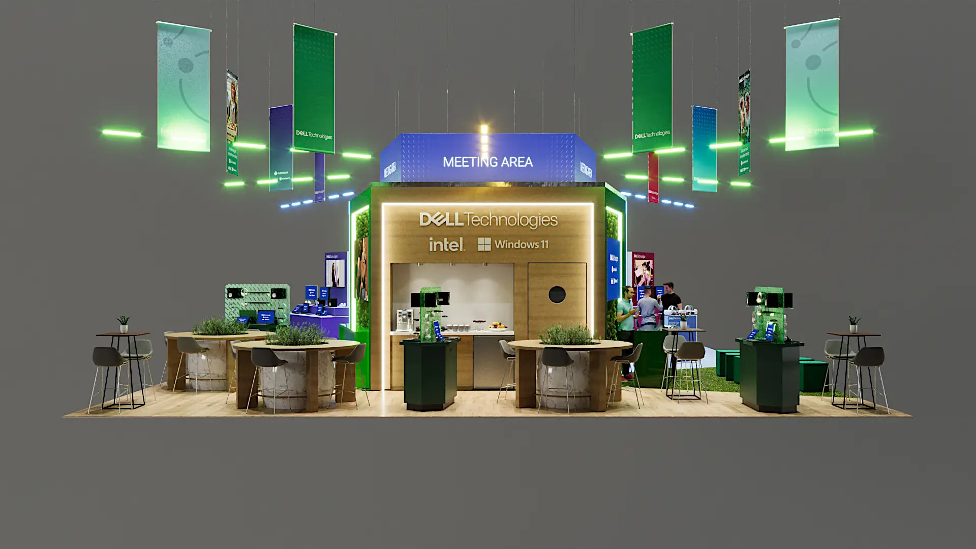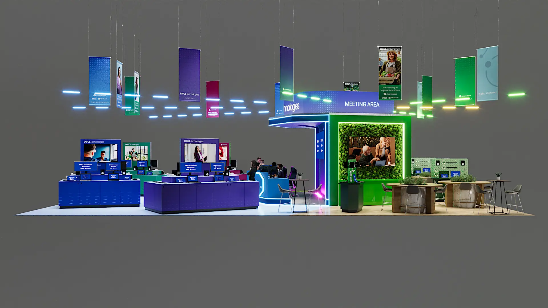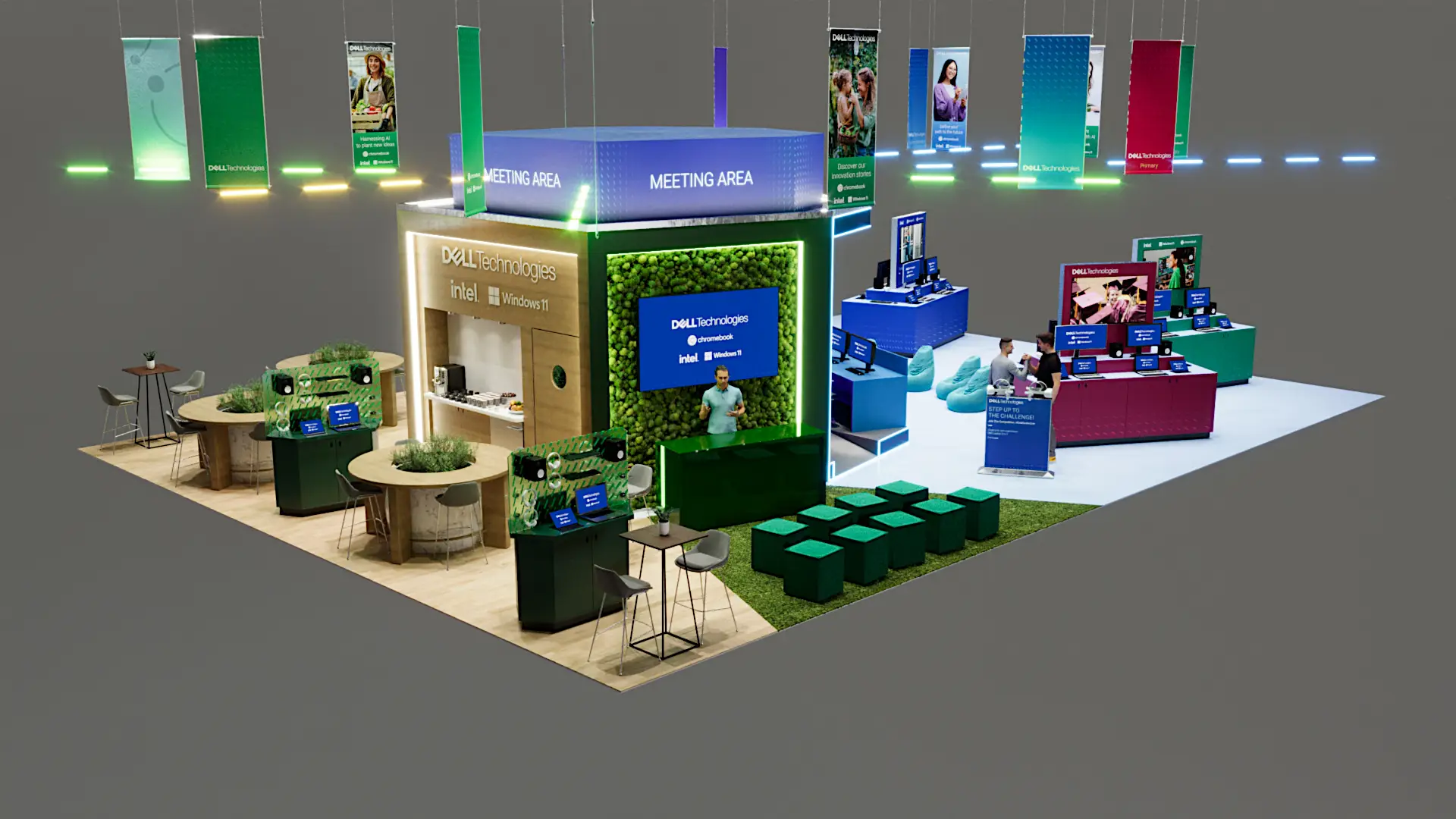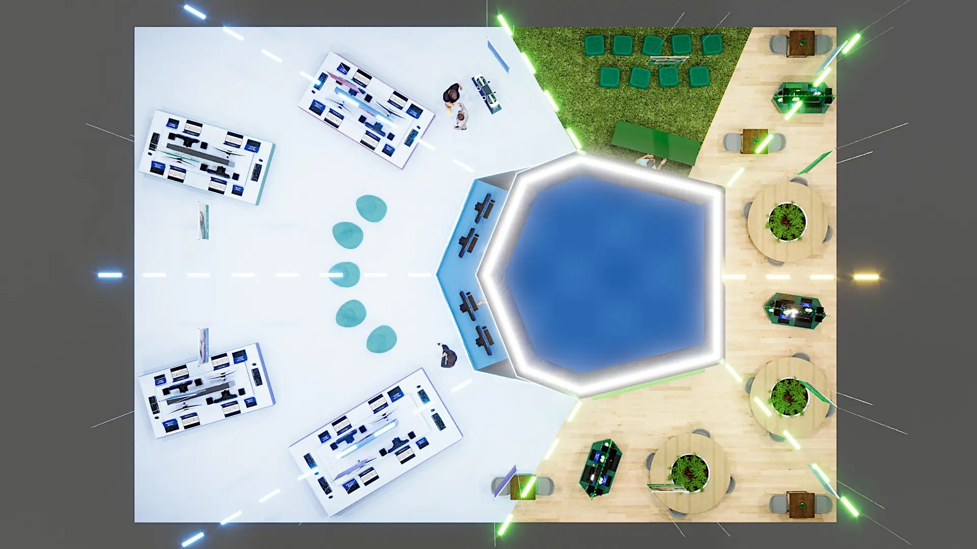 For the pitch we desided to create a 10m x 10m dining room with 3 close range projectors per wall with 4 tables with 8 diners. I used a pre built hall and made all interior walls and ceilings slightly off white (best for projections not blowing out). I decided to use a shiny black floor to create dramatic contrast and reflections wich will be visually ingageing with movement. Each table setup has a LED flooring that can project images and colours as well as controlled LED ceingling lights.