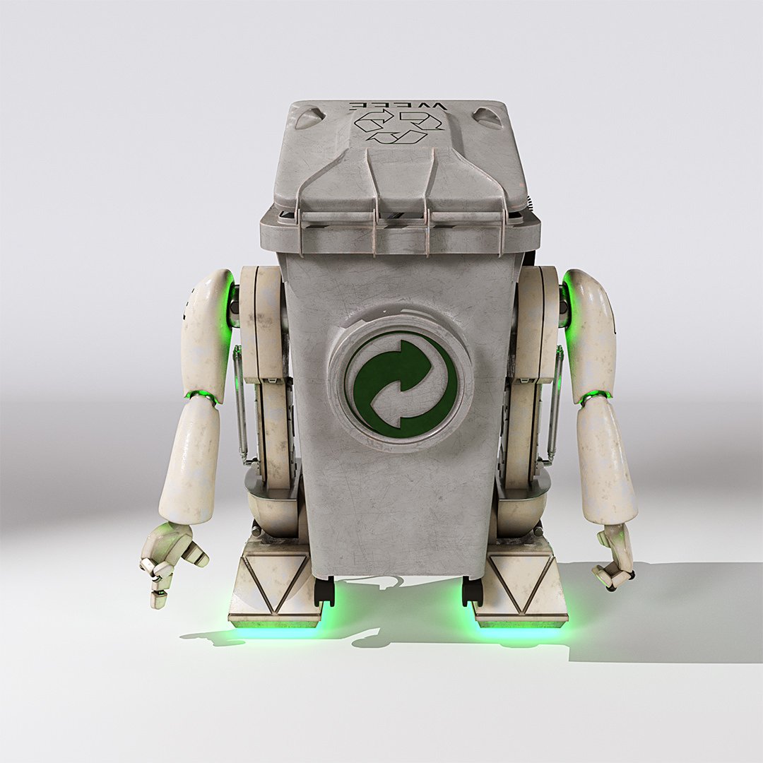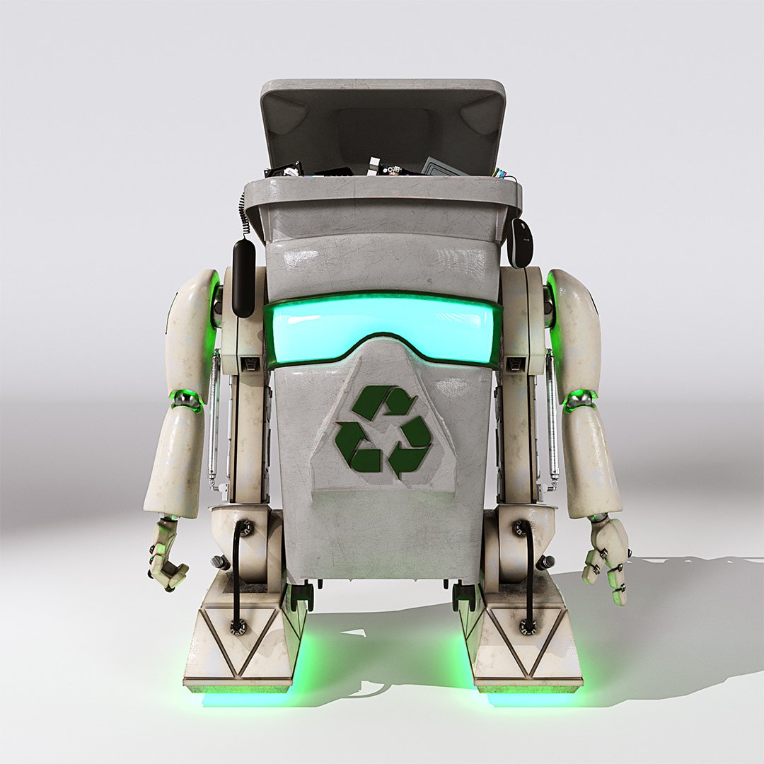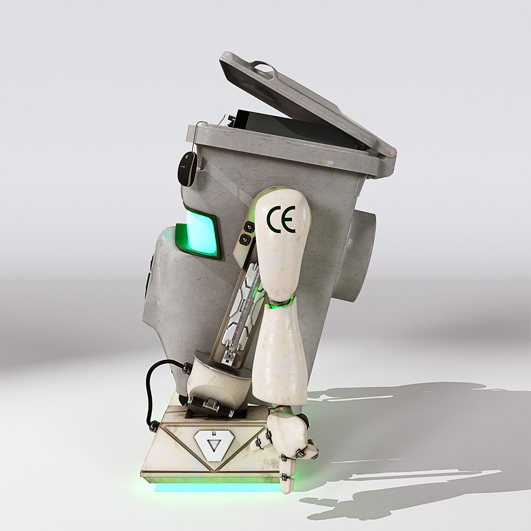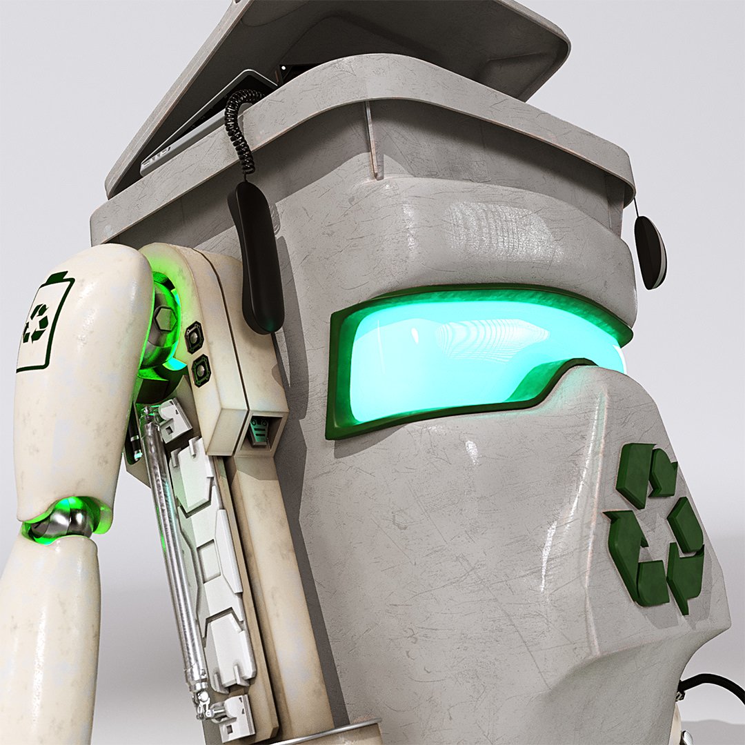 John Couchi (Identity Destruction) got in touch to design and develop a fourth mascot character for his company. The core object was a re-cycle bin. As we are both big Star Wars fans I suggested to use similar legs to R2D2 which he liked a lot. I used the same arms in keeping with the other characters. I used photo refs for the bin to model this. Initially he had a grill face but John thought it looked too scary so we flattened the mouth piece and stuck the recycle logo on there which works well as it is triangular.