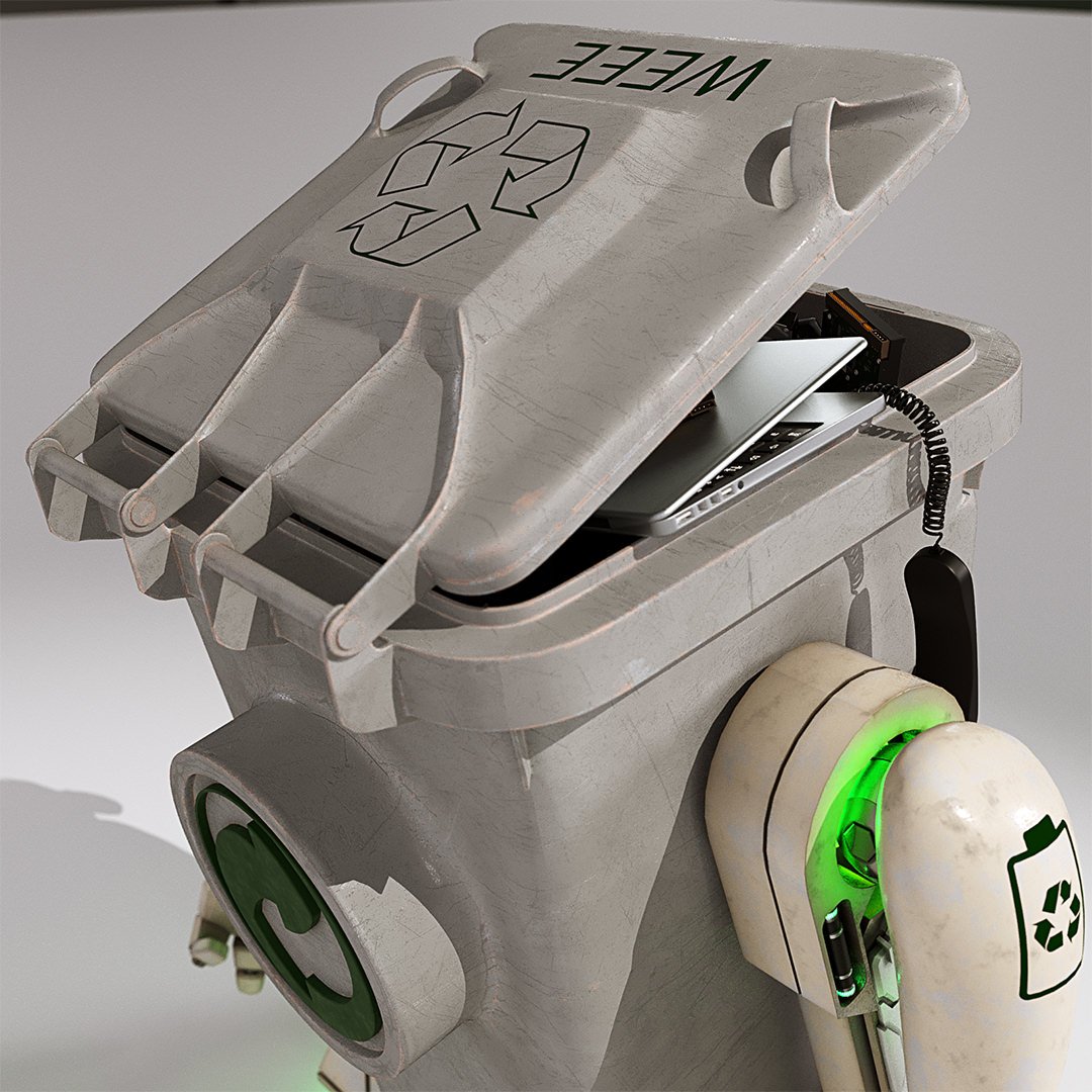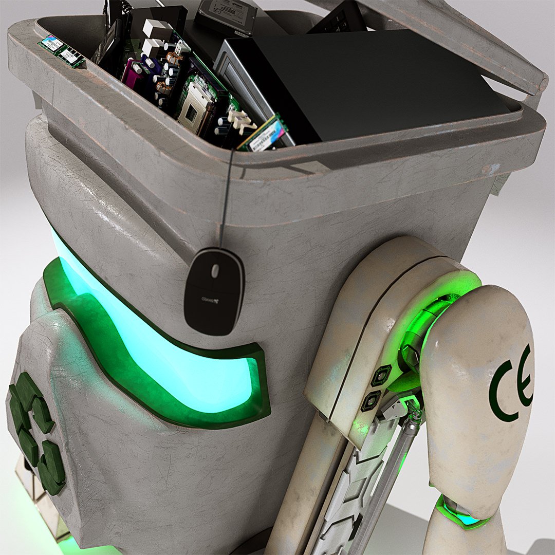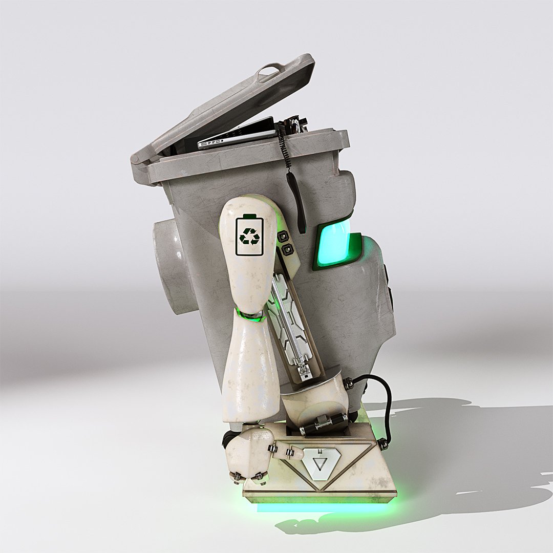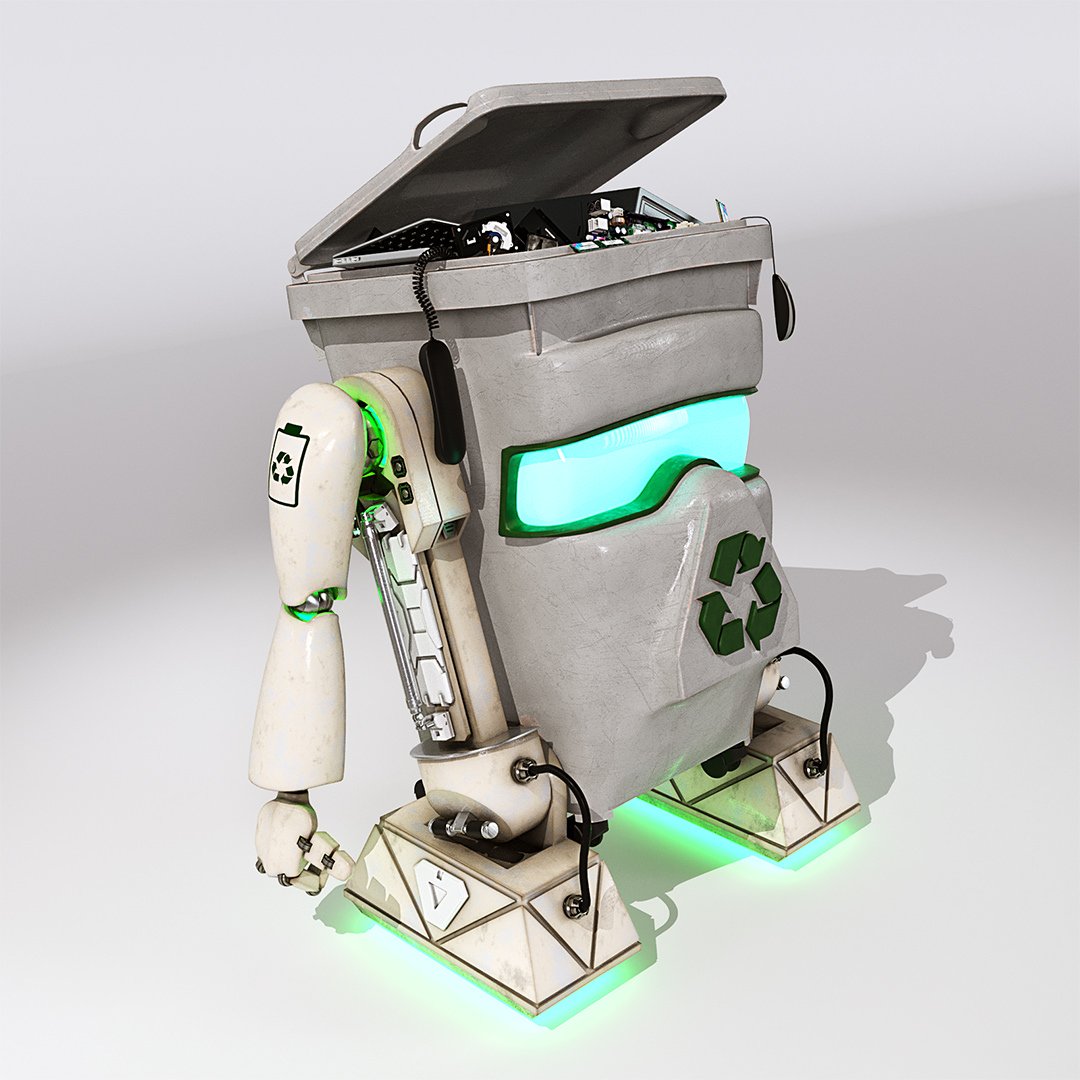 John Couchi (Identity Destruction) got in touch to design and develop a fourth mascot character for his company. The core object was a re-cycle bin. As we are both big Star Wars fans I suggested to use similar legs to R2D2 which he liked a lot. I used the same arms in keeping with the other characters. I used photo refs for the bin to model this. Initially he had a grill face but John thought it looked too scary so we flattened the mouth piece and stuck the recycle logo on there which works well as it is triangular.