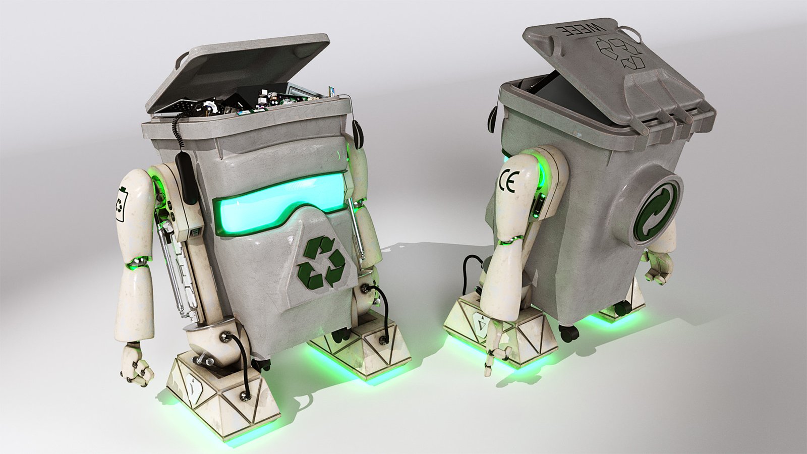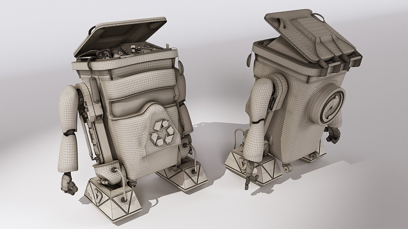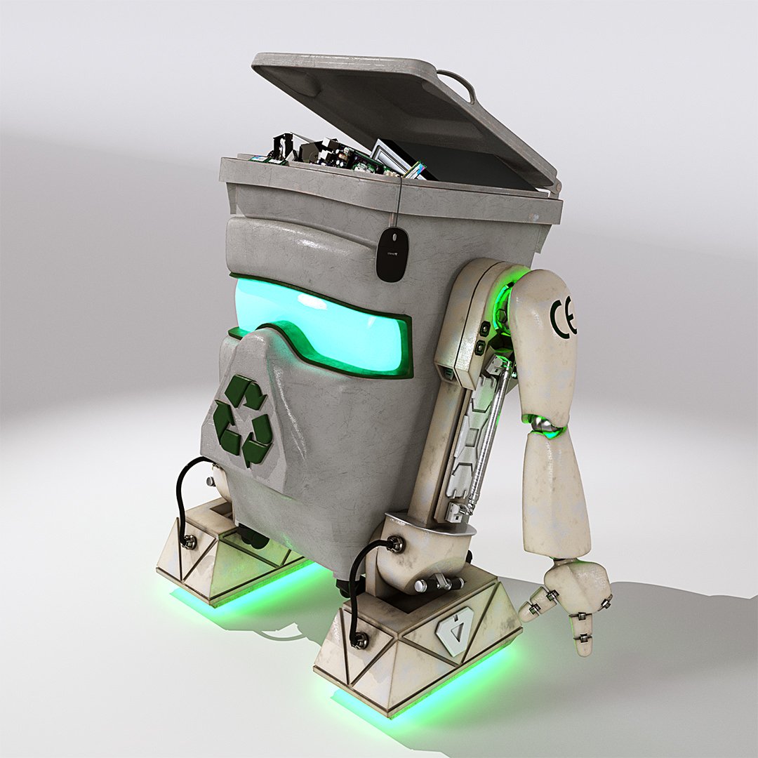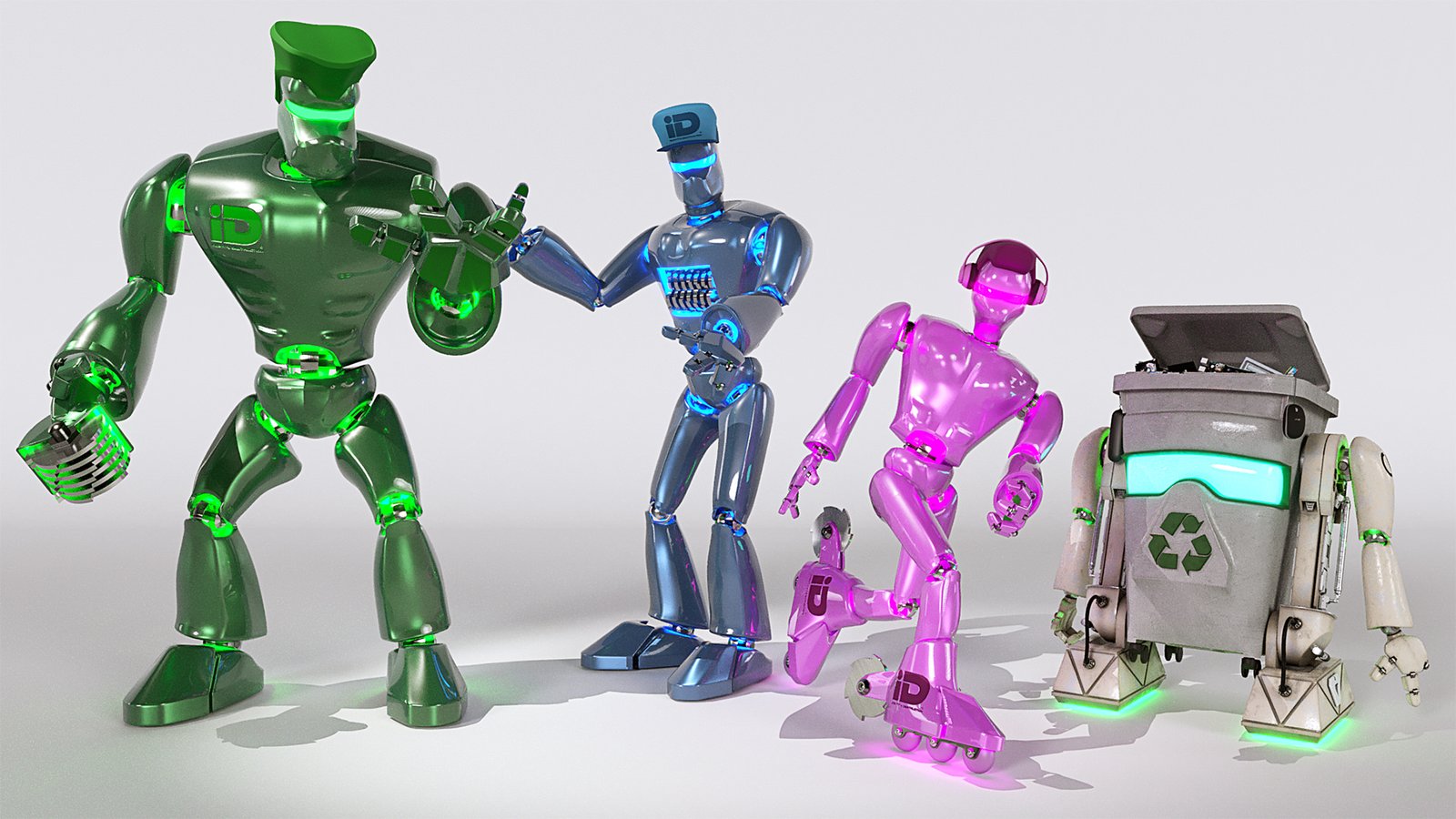 John Couchi (Identity Destruction) got in touch to design and develop a fourth mascot character for his company. The core object was a re-cycle bin. As we are both big Star Wars fans I suggested to use similar legs to R2D2 which he liked a lot. I used the same arms in keeping with the other characters. I used photo refs for the bin to model this. Initially he had a grill face but John thought it looked too scary so we flattened the mouth piece and stuck the recycle logo on there which works well as it is triangular.