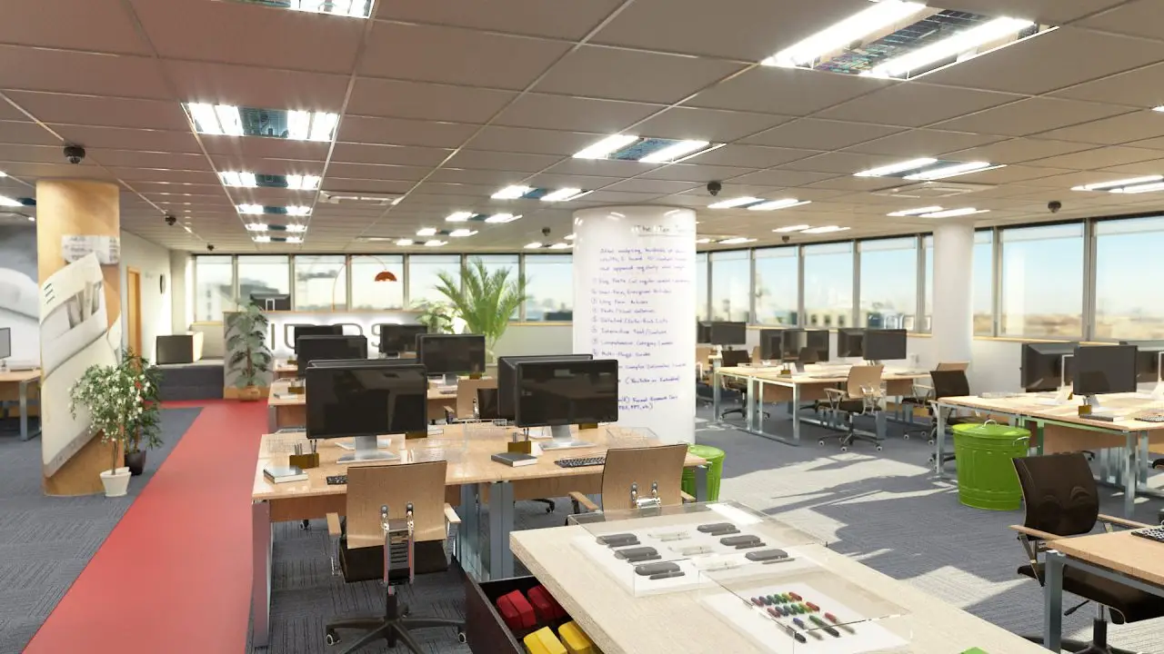 I was given blueprints of the office which I modelled up in Cinema 4D. All the product tables and graphics were worked up with the Creative Director.