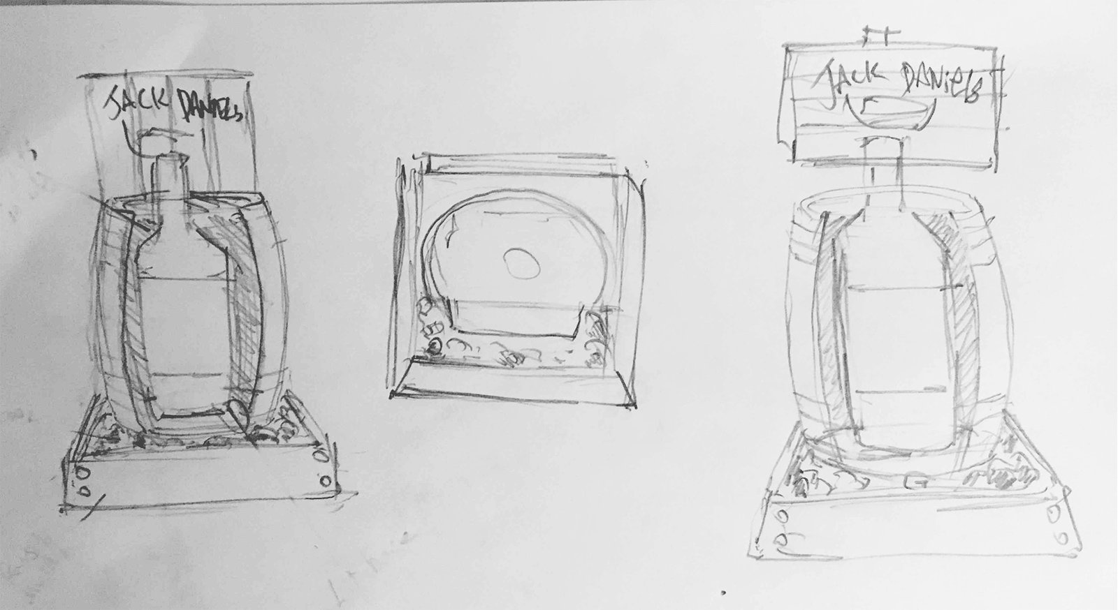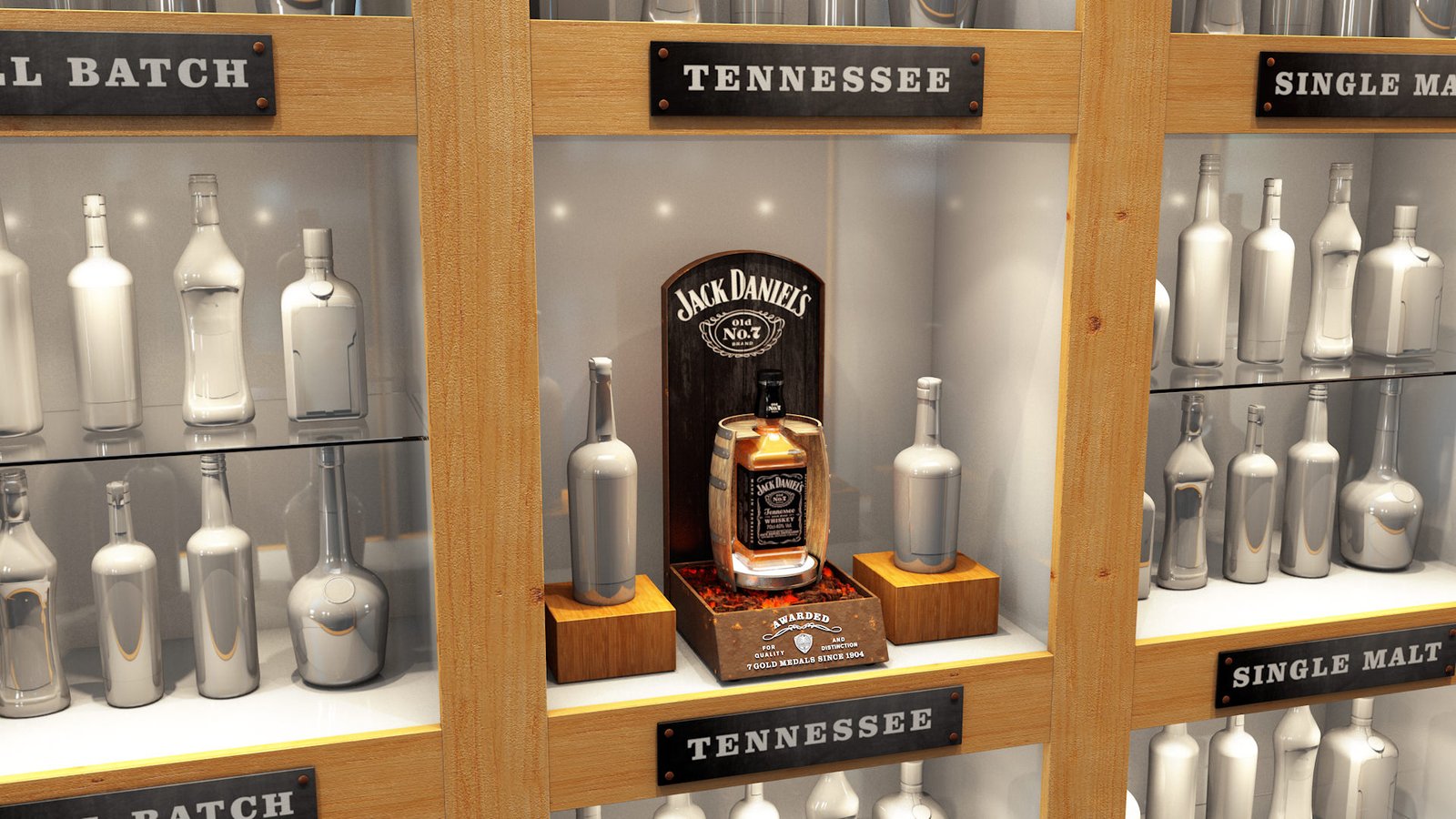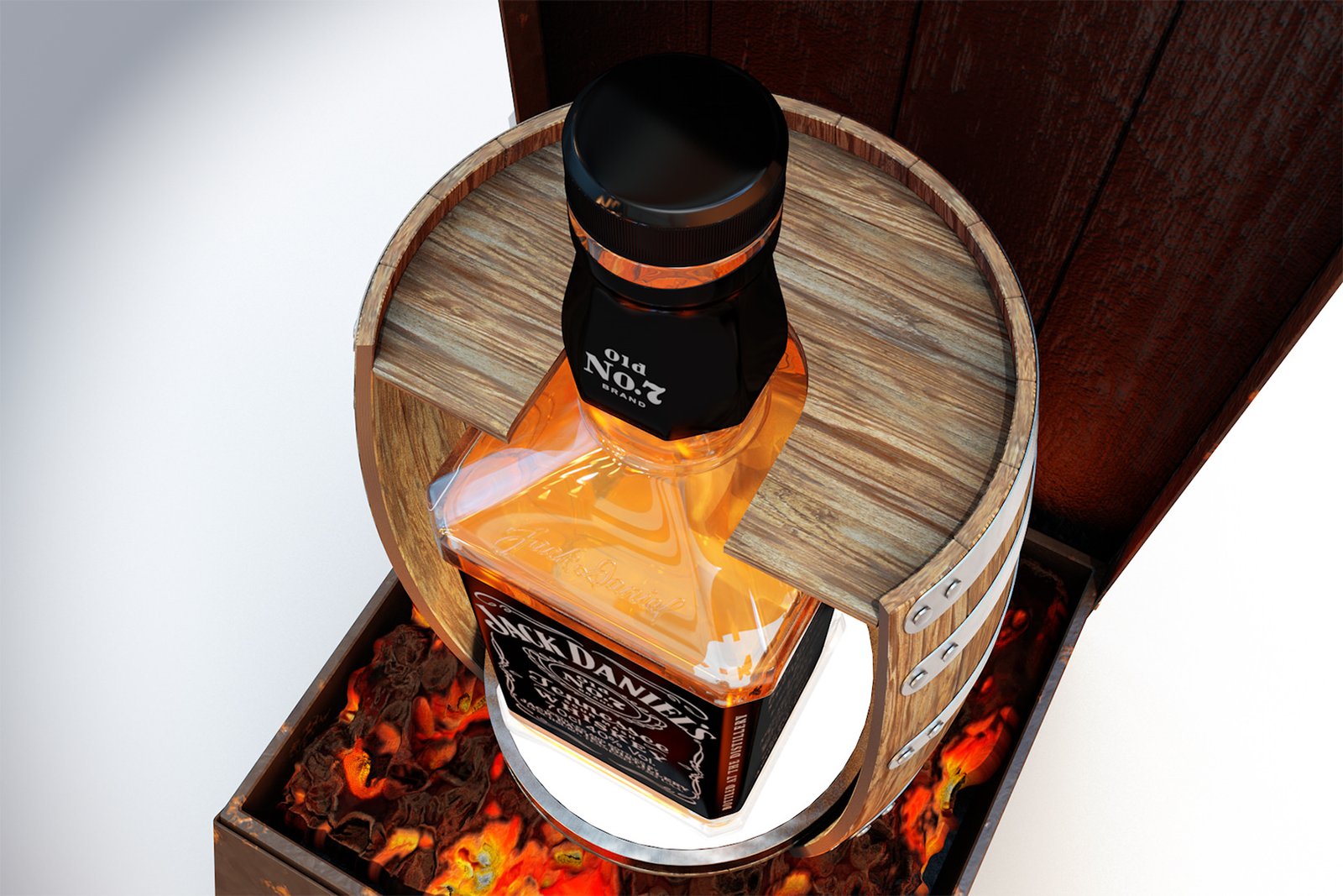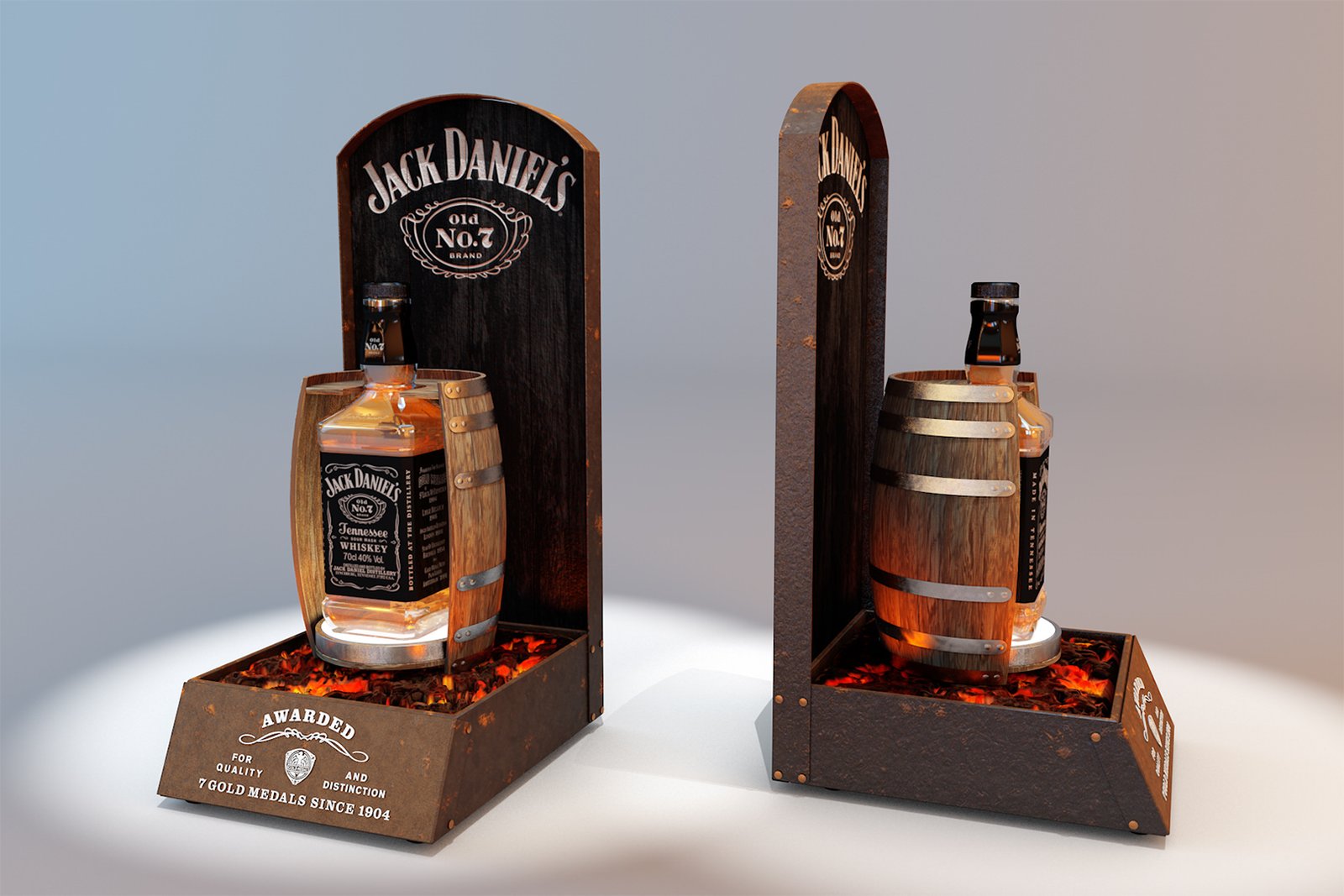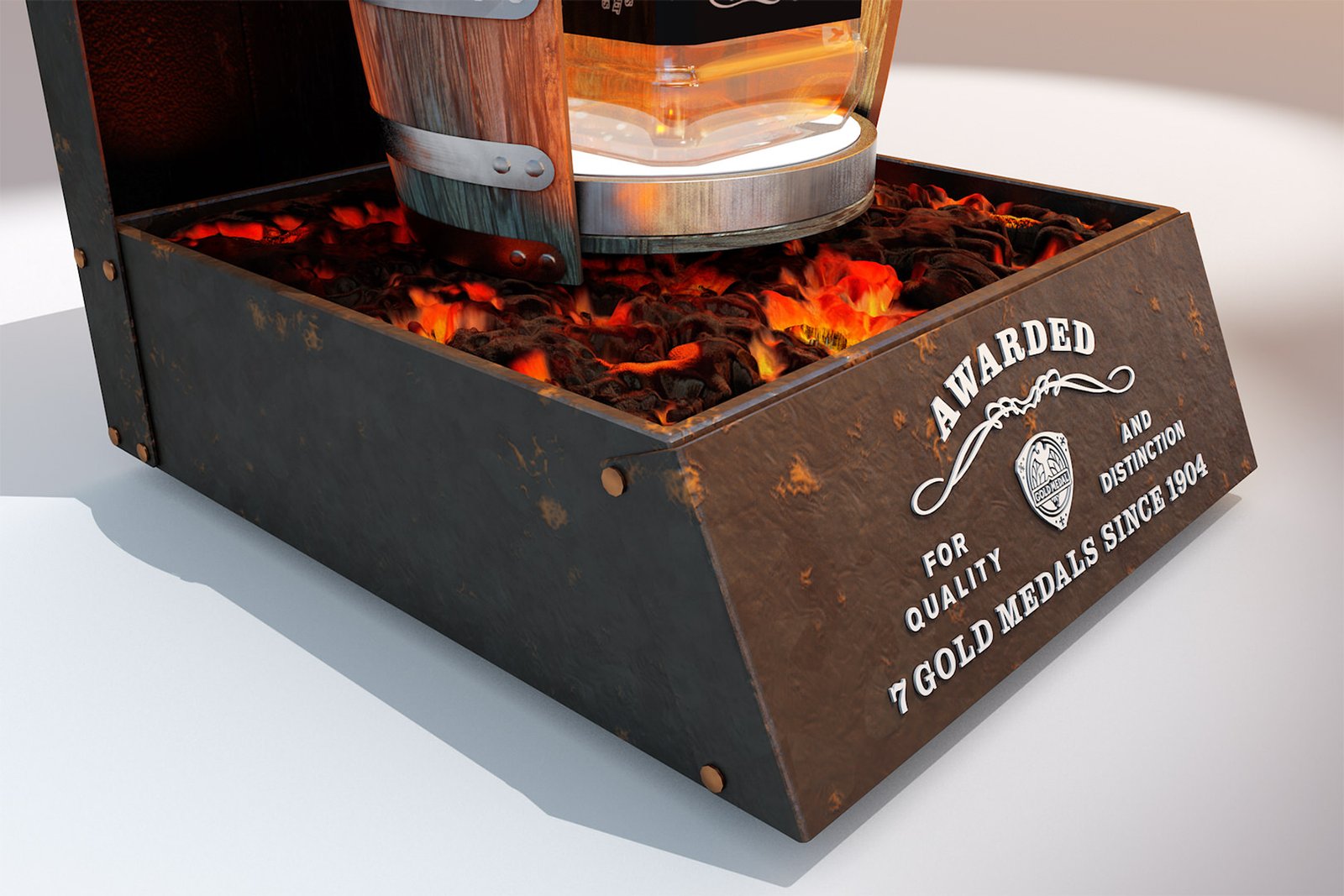 They wanted a design that really made the bottle stand out. The base has a uplight to light up the whiskey colour inside and the glowing coals are lit as well.