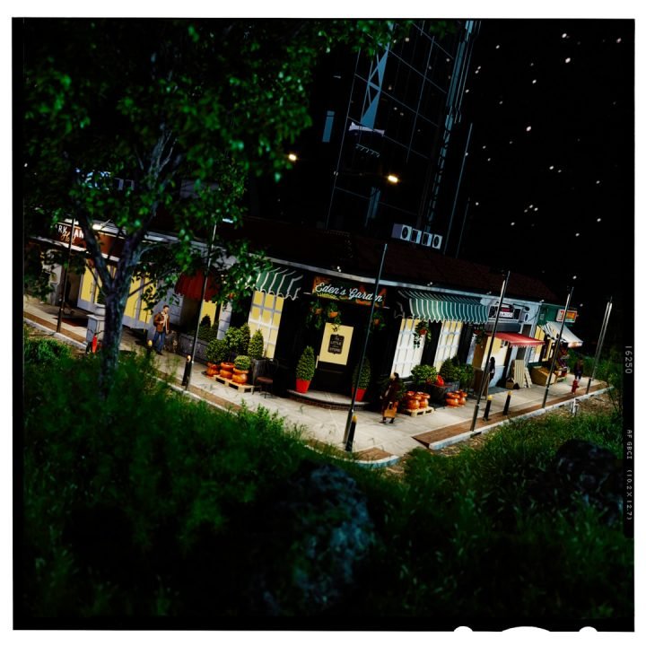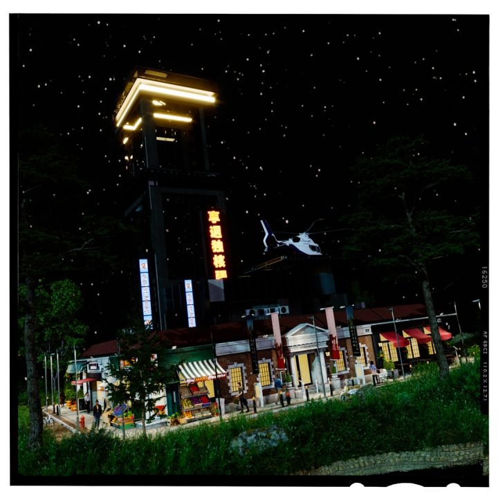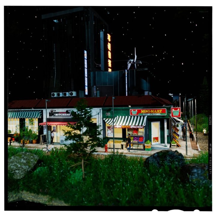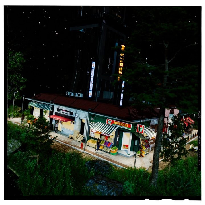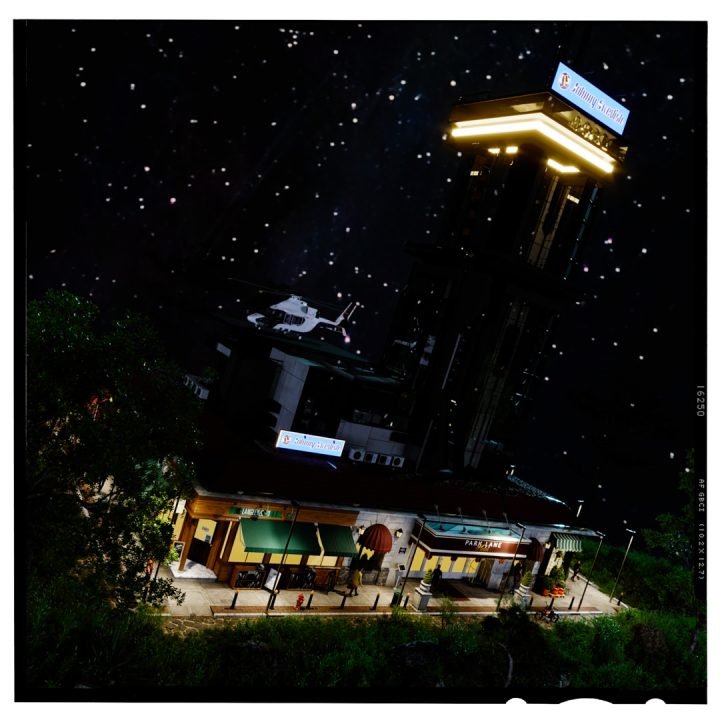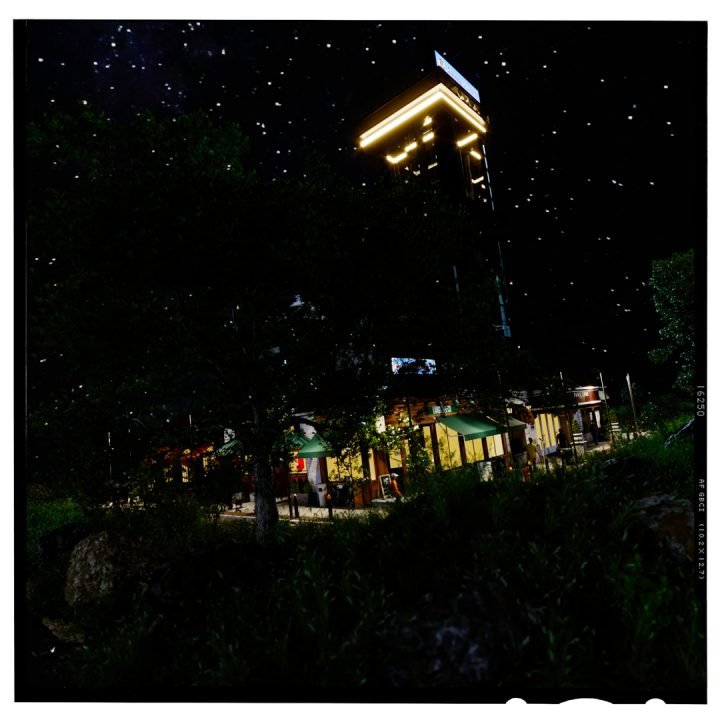 The whole scene was lit using Corona’s sky & sun object to get good control of the shadows. I used a native C4D sky object and mapped the clouds and stars on for final renders. I wanted it to look CGI created for this.