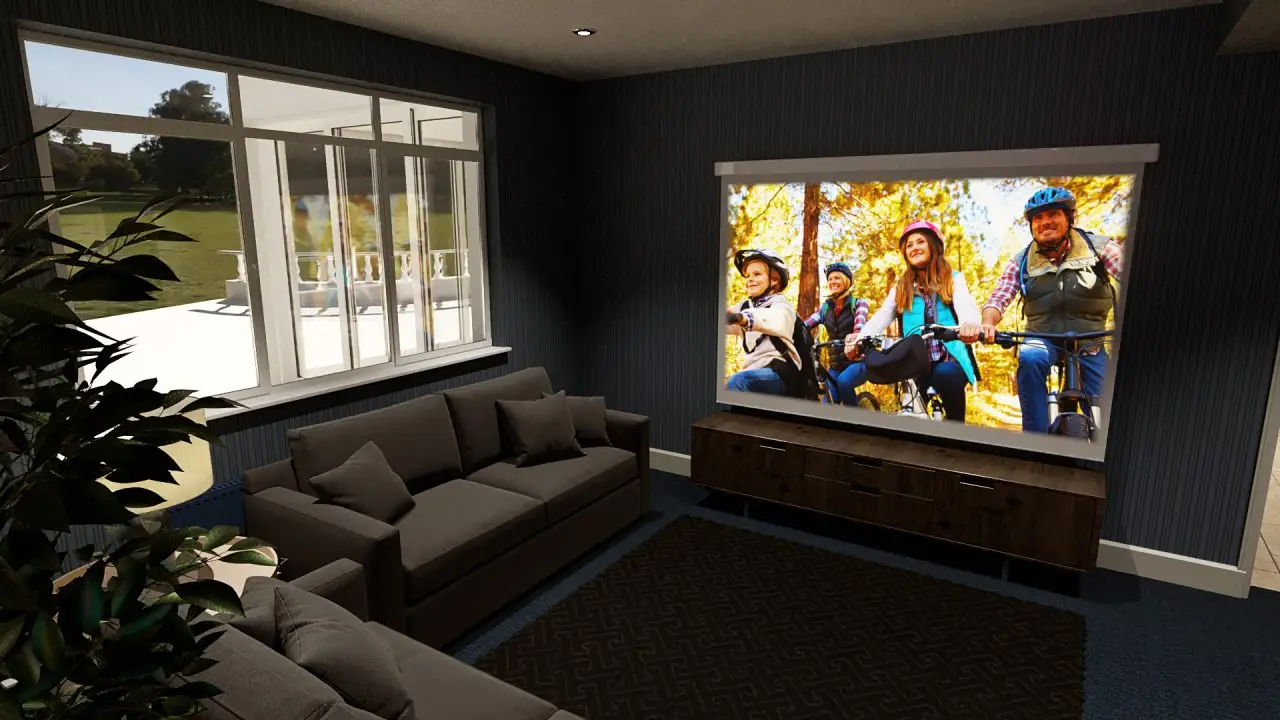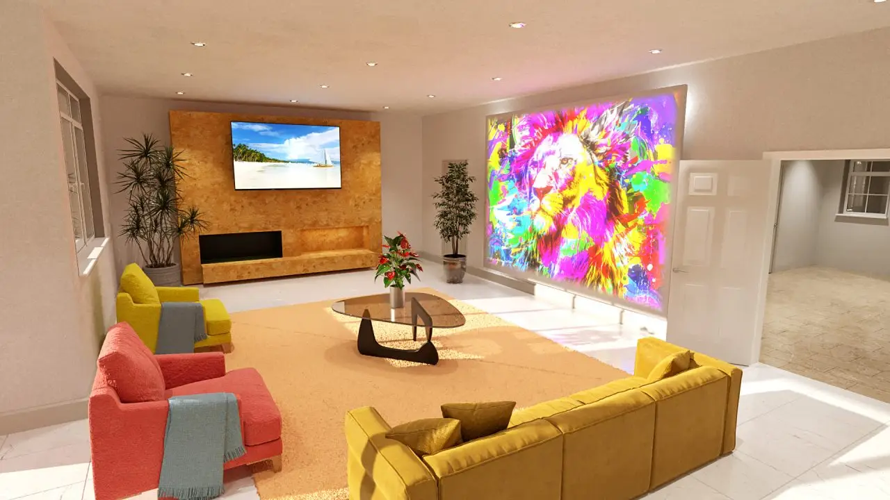 For the pitch we desided to create a 10m x 10m dining room with 3 close range projectors per wall with 4 tables with 8 diners. I used a pre built hall and made all interior walls and ceilings slightly off white (best for projections not blowing out). I decided to use a shiny black floor to create dramatic contrast and reflections wich will be visually ingageing with movement. Each table setup has a LED flooring that can project images and colours as well as controlled LED ceingling lights.