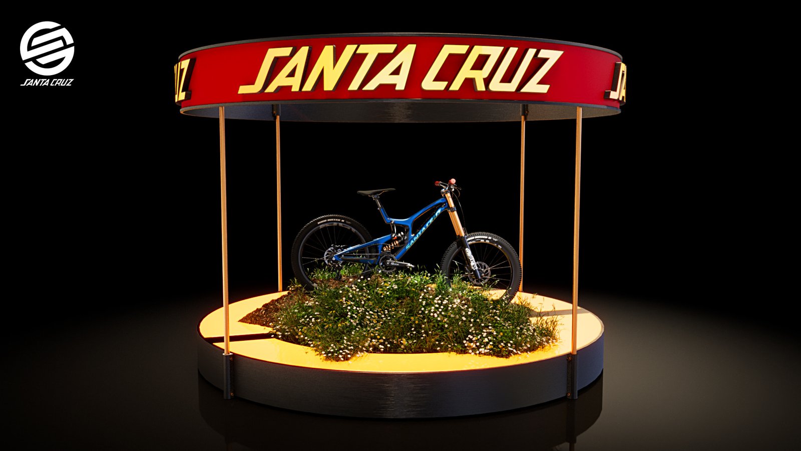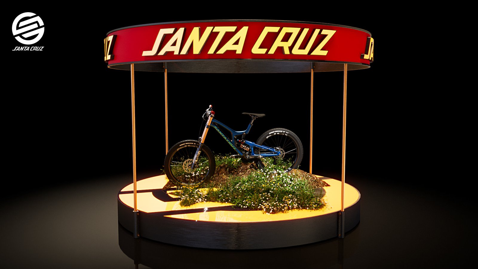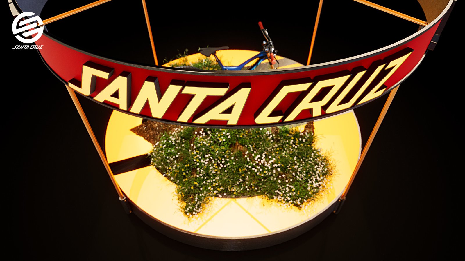 I bought the bike on Turbosquid.com as a FBX model which I had to texture myself for Corona 10. I used the circular emblem from the logo as a lit floor. The terrain was created using ‘Corona Scatter’ with grass & plants.