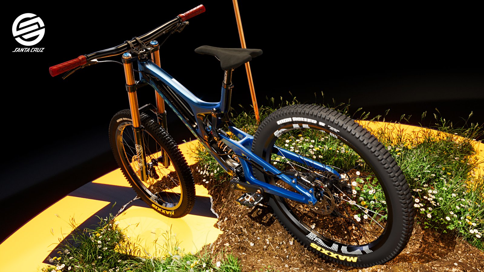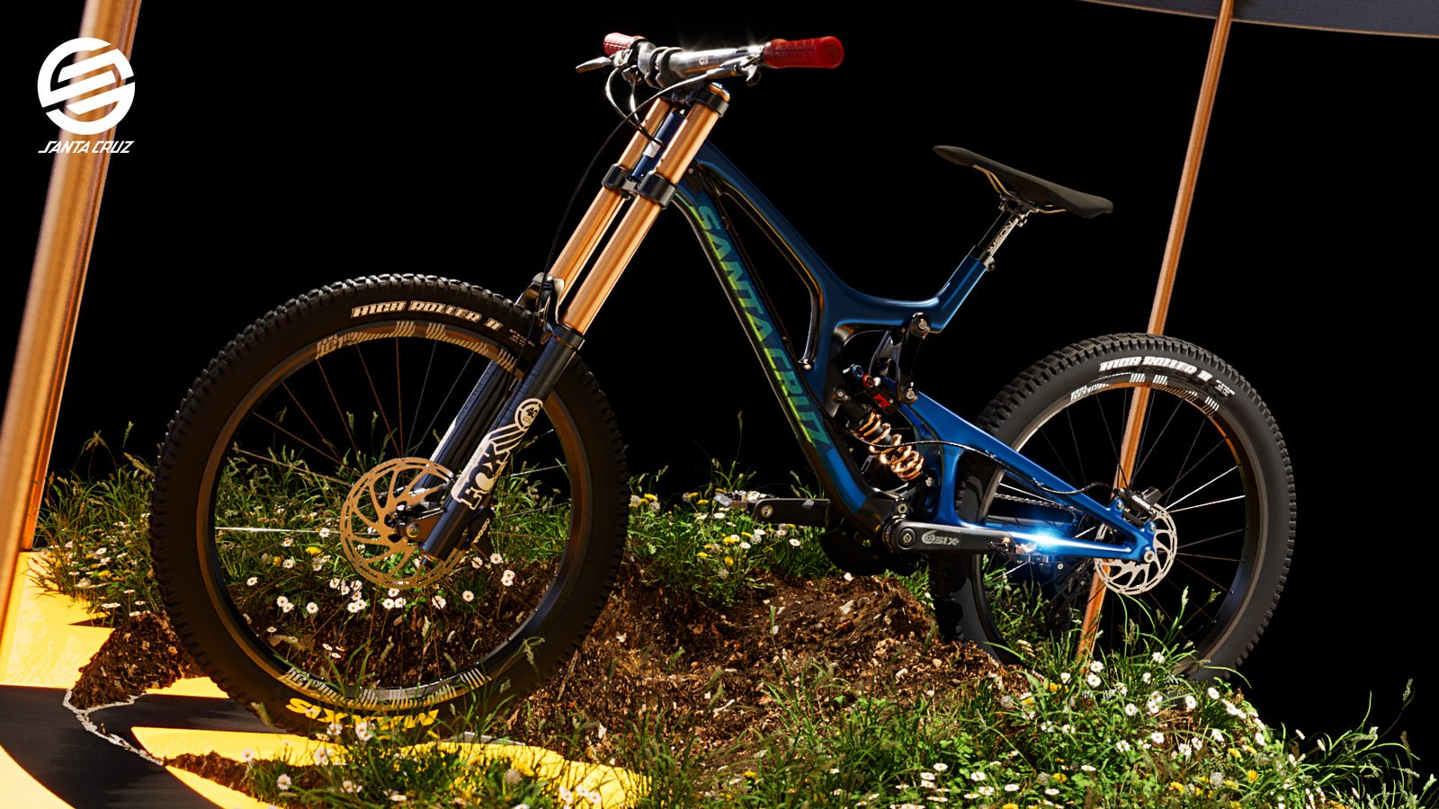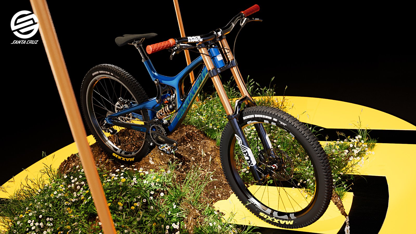 I bought the bike on Turbosquid.com as a FBX model which I had to texture myself for Corona 10. I used the circular emblem from the logo as a lit floor. The terrain was created using ‘Corona Scatter’ with grass & plants.