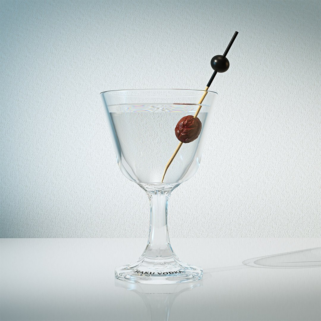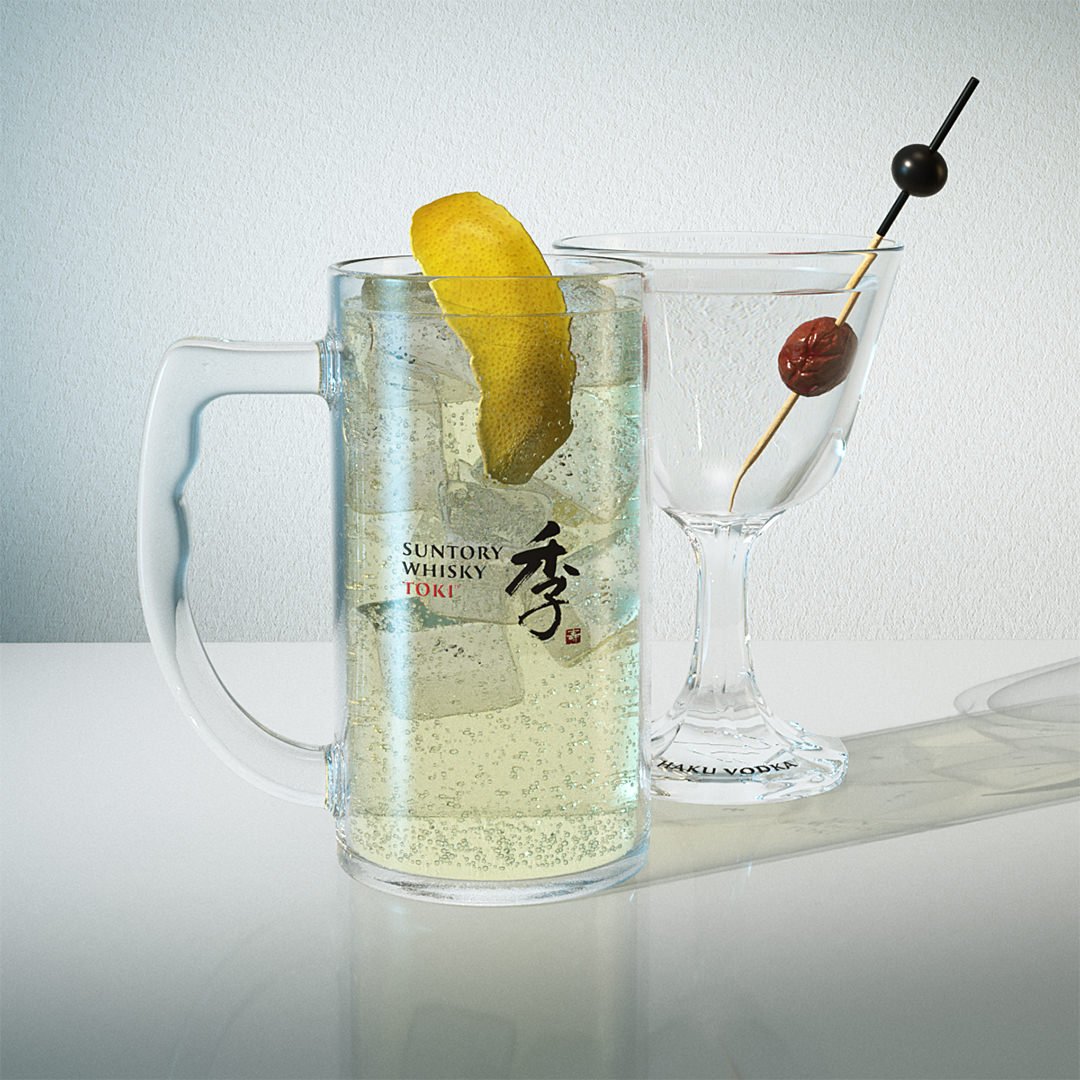 The TOKI glass was fairly straight forward to create using polygon modelling then I put a sub division surface on it to round of the edges. The ice and all the fizz was tricky to get done and keep the render times down. The HAKU glass base was a bit tricky to get the curved lines going down to the rim and also to imprint and join the logo to the base.